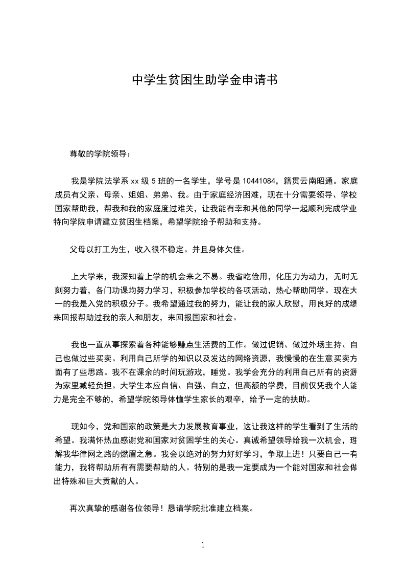 我是学院法学系xx级5班的一名学生,学号是10441084,籍贯云南昭通。家庭成员有父亲、母亲、姐姐、弟弟、我。由于家庭经济困难,现在十分需要领导、学校、国家帮助我,帮我和我的家庭度过难关,让我能有幸和其他的同学一起顺利完成学业。特向学院申请建立贫困生档案,希望学院给予帮助和支持。