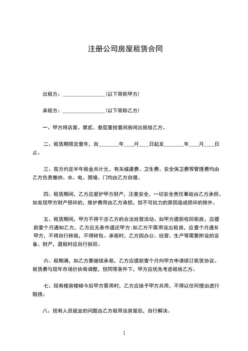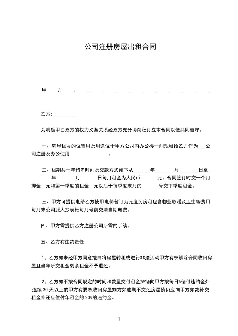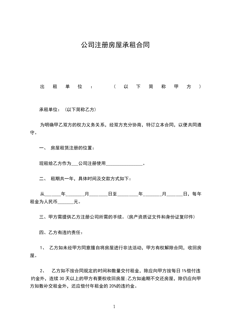一、房屋租赁的位置用及用途位于甲方公司内办公楼一间现租给乙方作为___公司注册及办公使用________________.