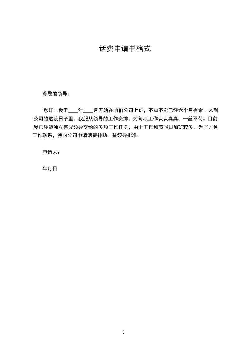 您好!我于____年____月开始在咱们公司上班,不知不觉已经六个月有余。来到公司的这段日子里,我服从领导的工作安排,对每项工作认认真真、一丝不苟。目前,我已经能独立完成领导交给的多项工作任务,由于工作和节假日加班较多,为了方便工作联系,特向公司申请话费补助。望领导批准。