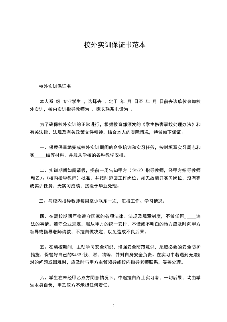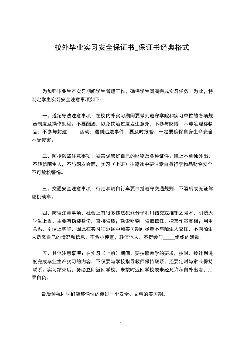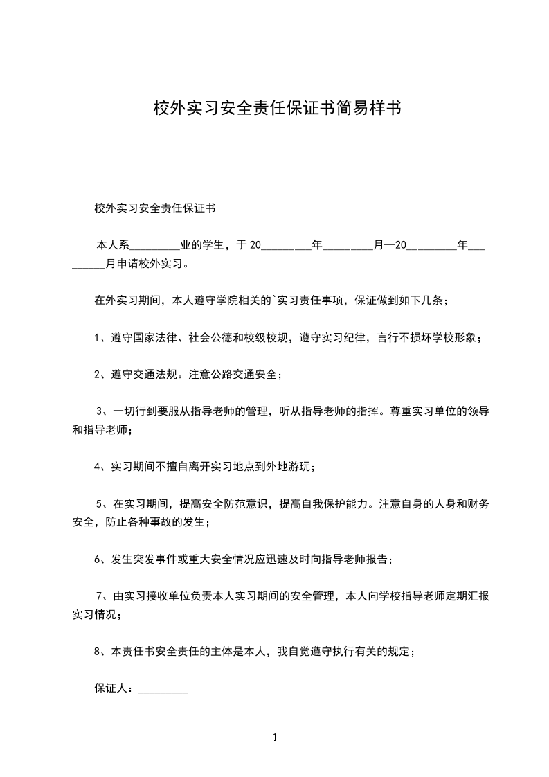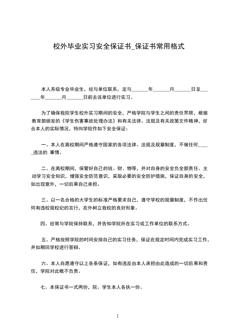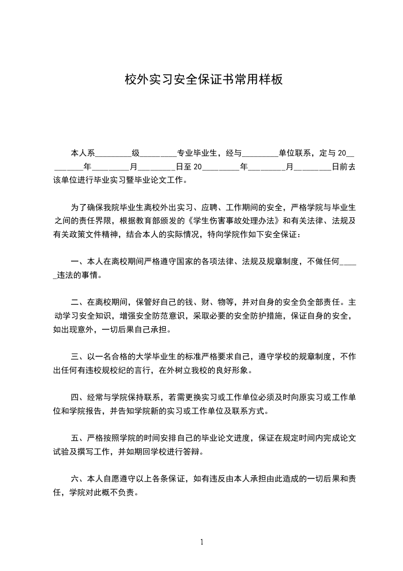 本人系××××××学院××××××××××班的×××,经与××××××××××公司联系,定于××××年××月至××××年××月前去该单位进行毕业实习工作。为了确保我院毕业生离校外出实习、期间的安全,严格学院与毕业生之间的责任界限,结合本人的实际情况,特向学院作如下保证: