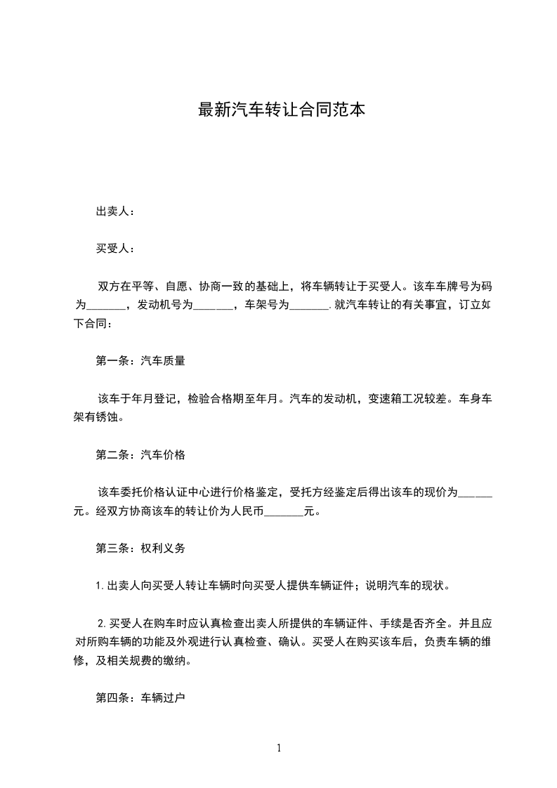 双方在平等、自愿、协商一致的基础上,将车辆转让于买受人。该车车牌号为码为_______,发动机号为_______,车架号为_______.就汽车转让的有关事宜,订立如下合同: