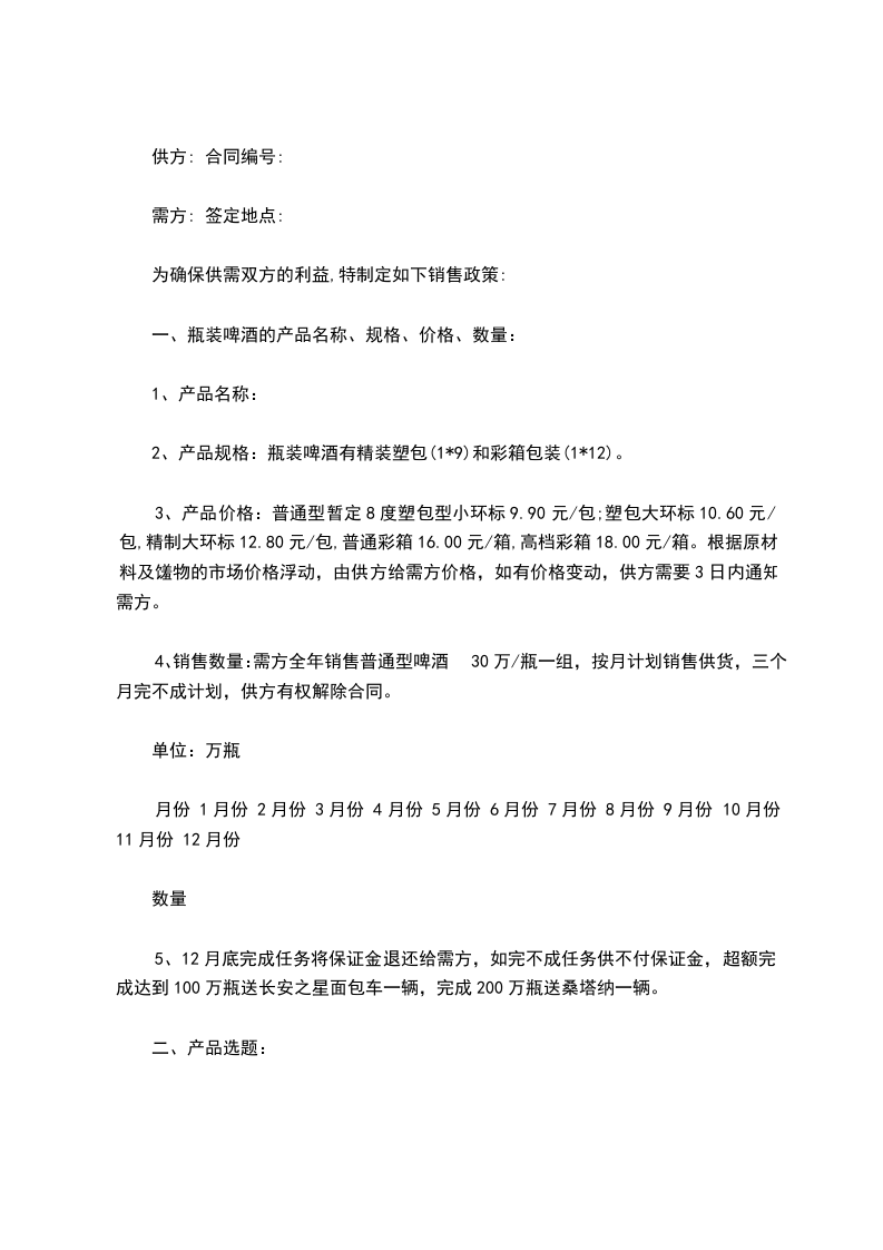 4、销售数量:需方全年销售普通型啤酒30万/瓶一组,按月计划销售供货,三个月完不成计划,供方有权解除合同。