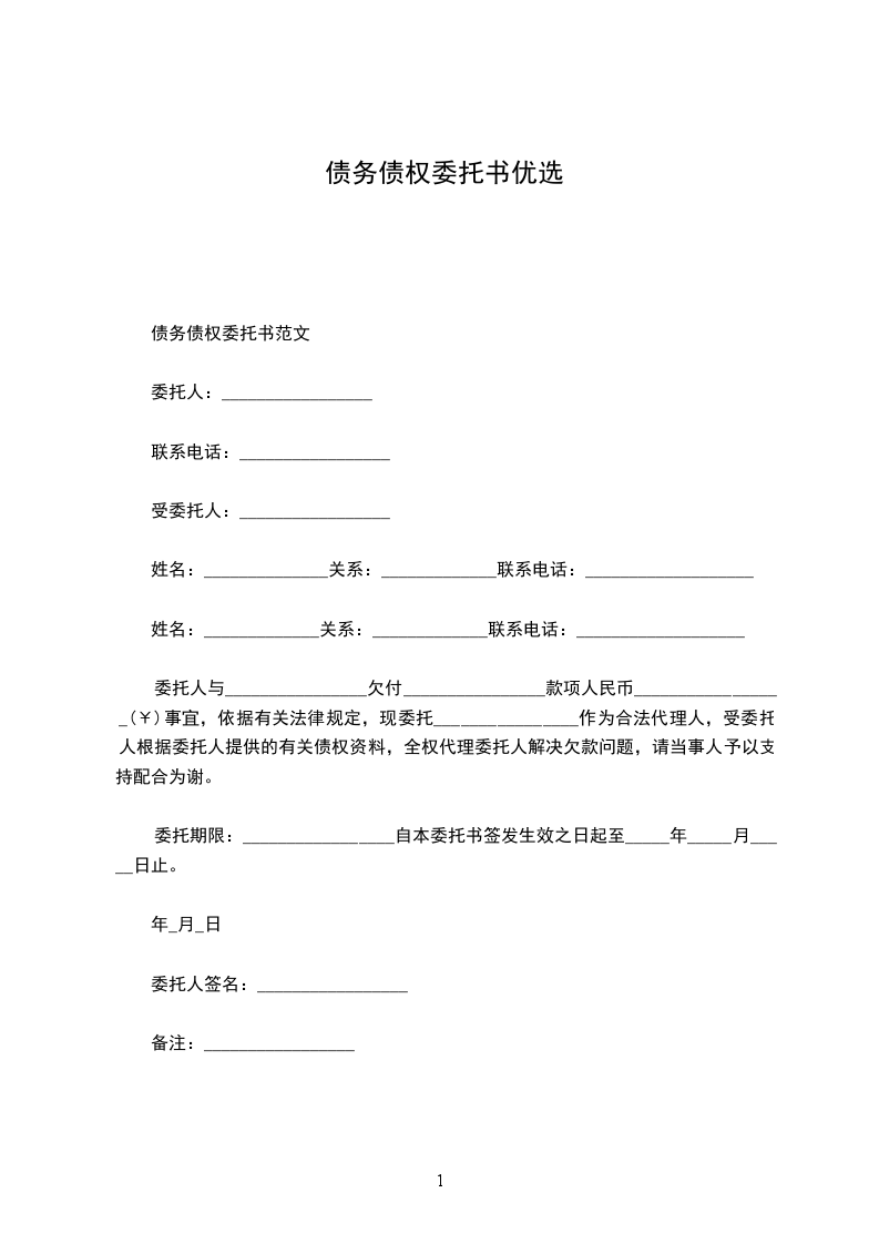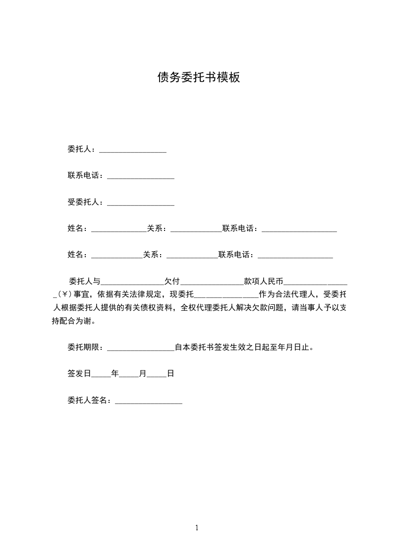 委托人与________________欠付________________款项人民币_________________(¥)事宜,依据有关法律规定,现委托________________作为合法代理人,受委托人根据委托人提供的有关债权资料,全权代理委托人解决欠款问题,请当事人予以支持配合为谢。