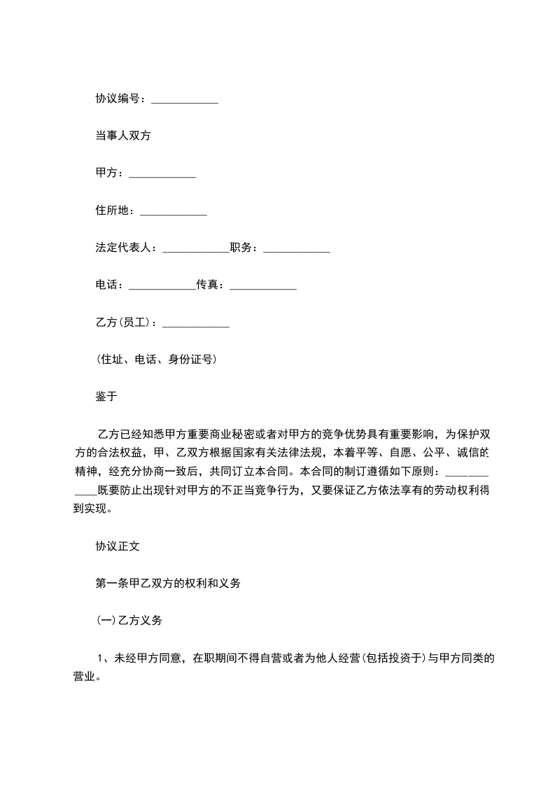 1、未经甲方同意,在职期间不得自营或者为他人经营(包括投资于)与甲方同类的营业。