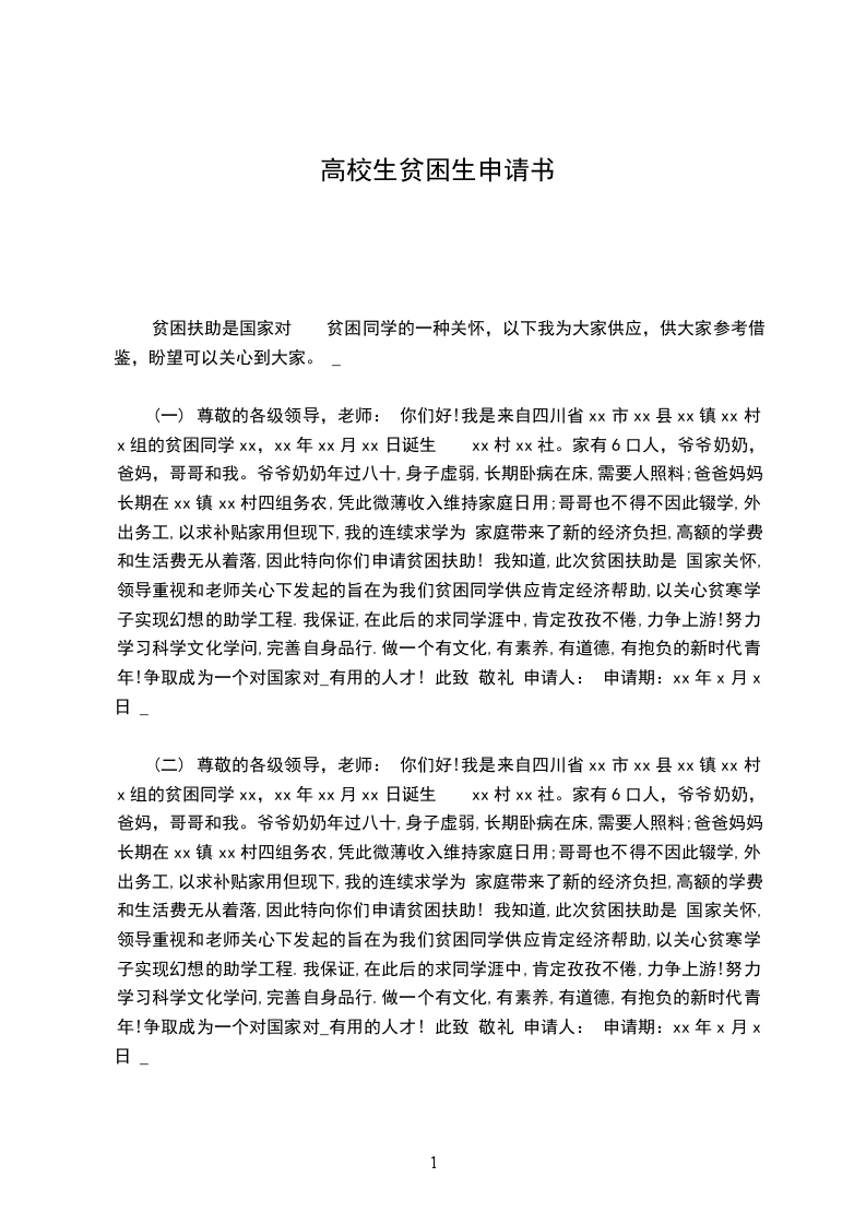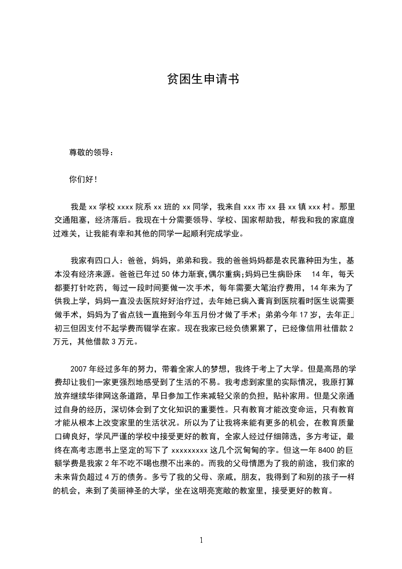 我是xx学校xxxx院系xx班的xx同学,我来自xxx市xx县xx镇xxx村。那里交通阻塞,经济落后。我现在十分需要领导、学校、国家帮助我,帮我和我的家庭度过难关,让我能有幸和其他的同学一起顺利完成学业。