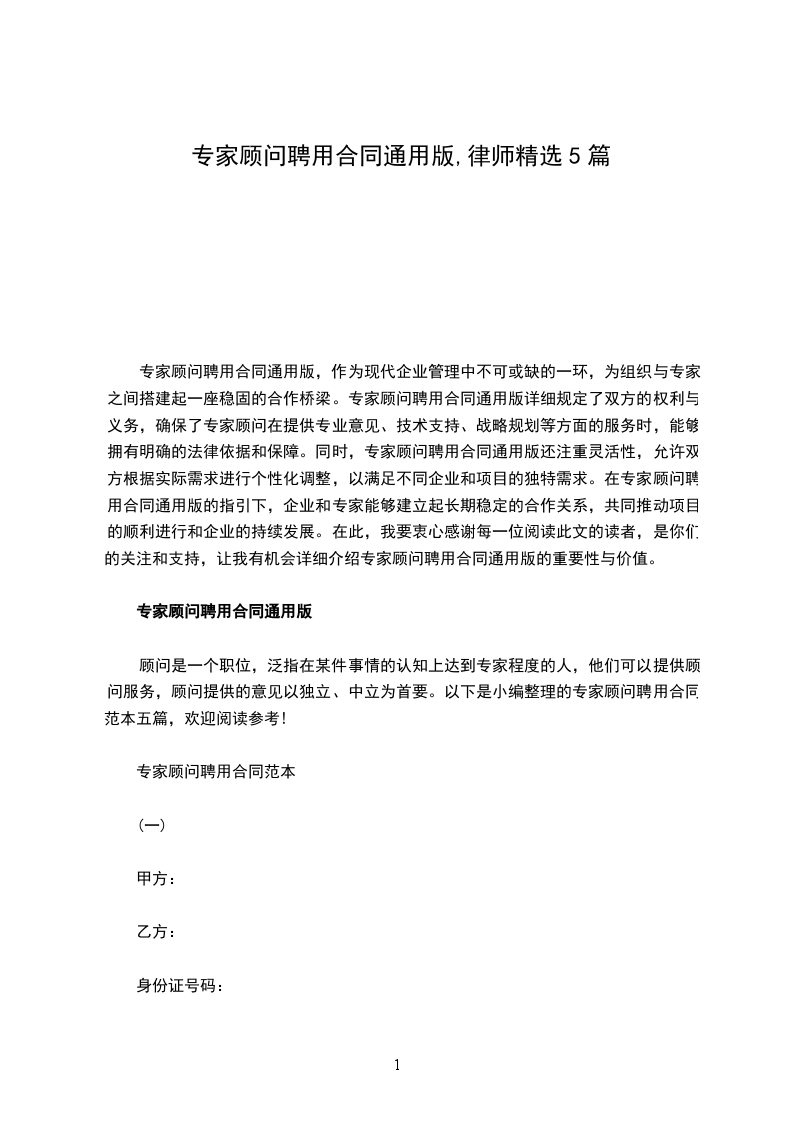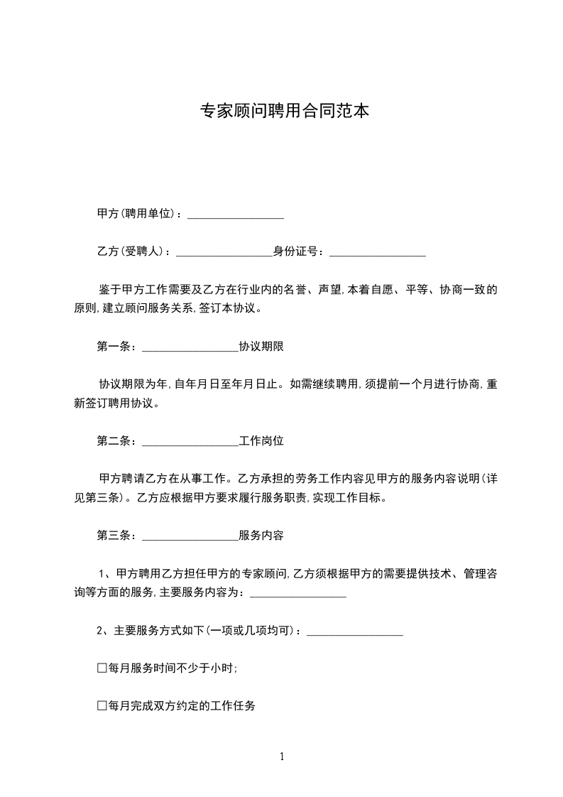 1、甲方聘用乙方担任甲方的专家顾问,乙方须根据甲方的需要提供技术、管理咨询等方面的服务,主要服务内容为:_________________