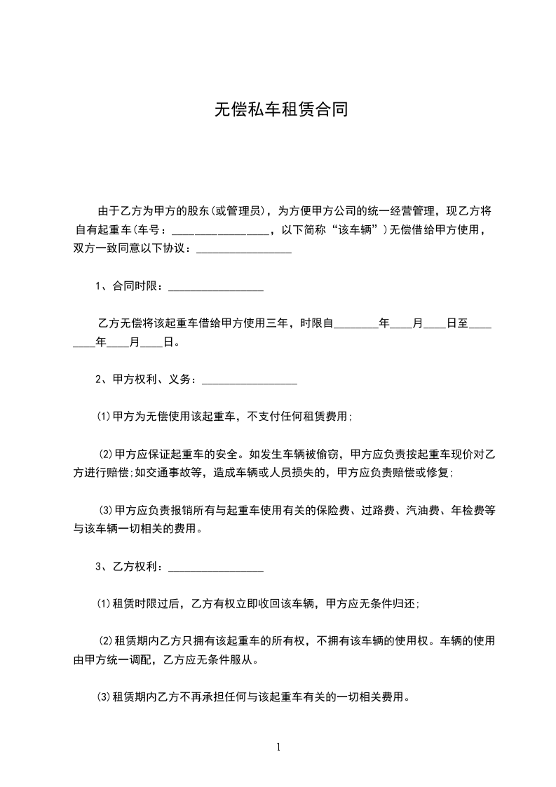由于乙方为甲方的股东(或管理员),为方便甲方公司的统一经营管理,现乙方将自有起重车(车号:_________________,以下简称“该车辆”)无偿借给甲方使用,双方一致同意以下协议:_________________