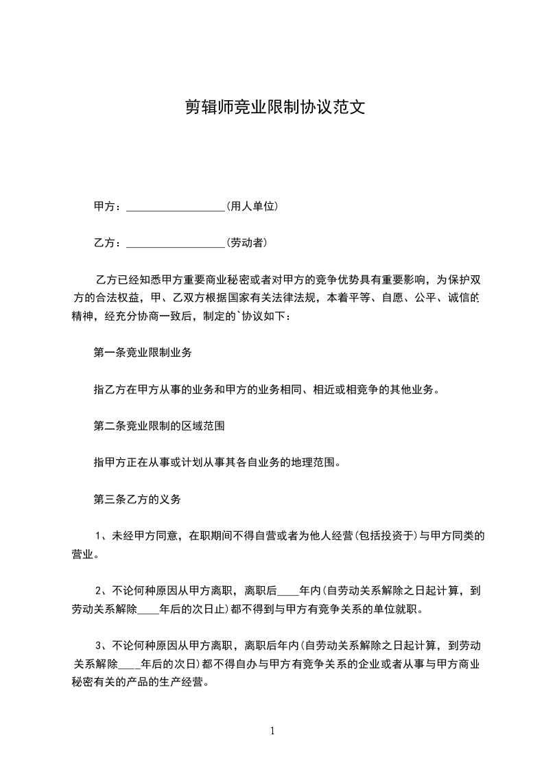 1、乙方承诺,未经甲方同意,在职期间不得自己经营或者为他人经营与甲方同类企业;