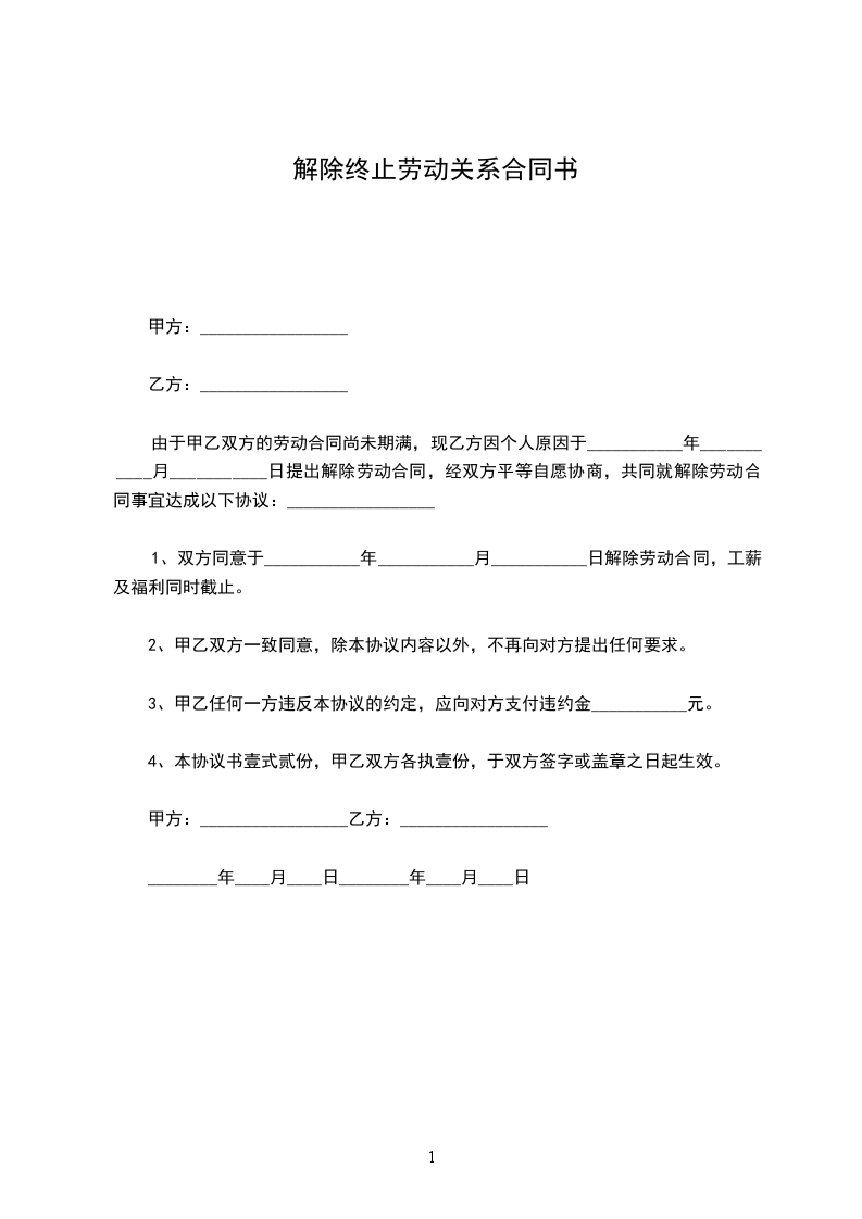 1、双方同意于___________年___________月___________日解除劳动合同,工薪及福利同时截止。