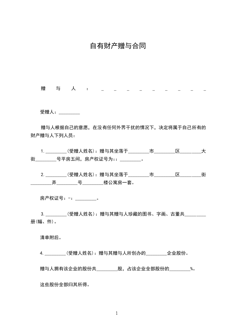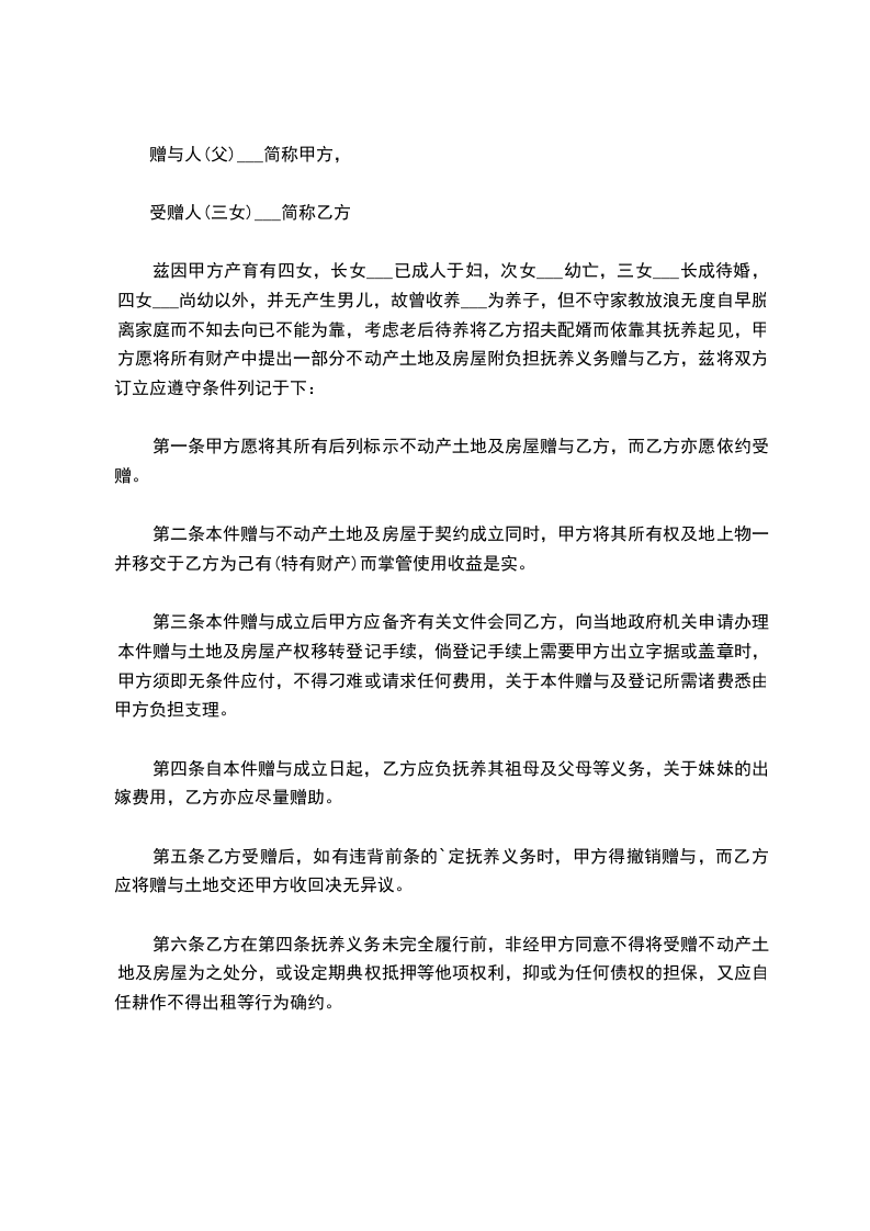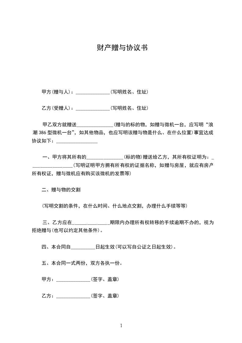 一、甲方将其所有的_______________(标的物)赠送给乙方,其所有权证明为:_________________(写明证明甲方拥有所有权的证据名称,如赠与房屋,就应有房产所有权证,赠与微机应有购买该微机的发票等)