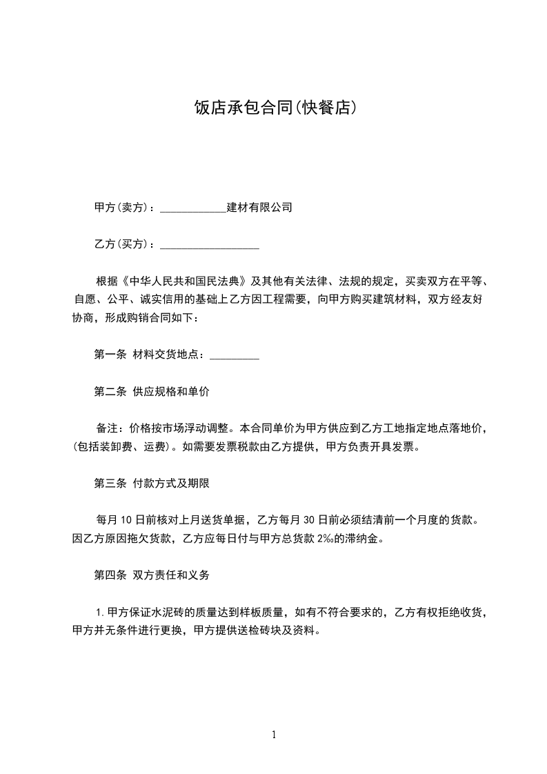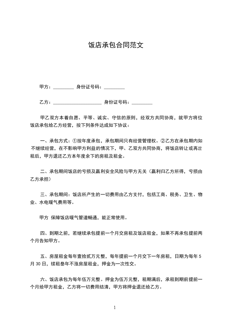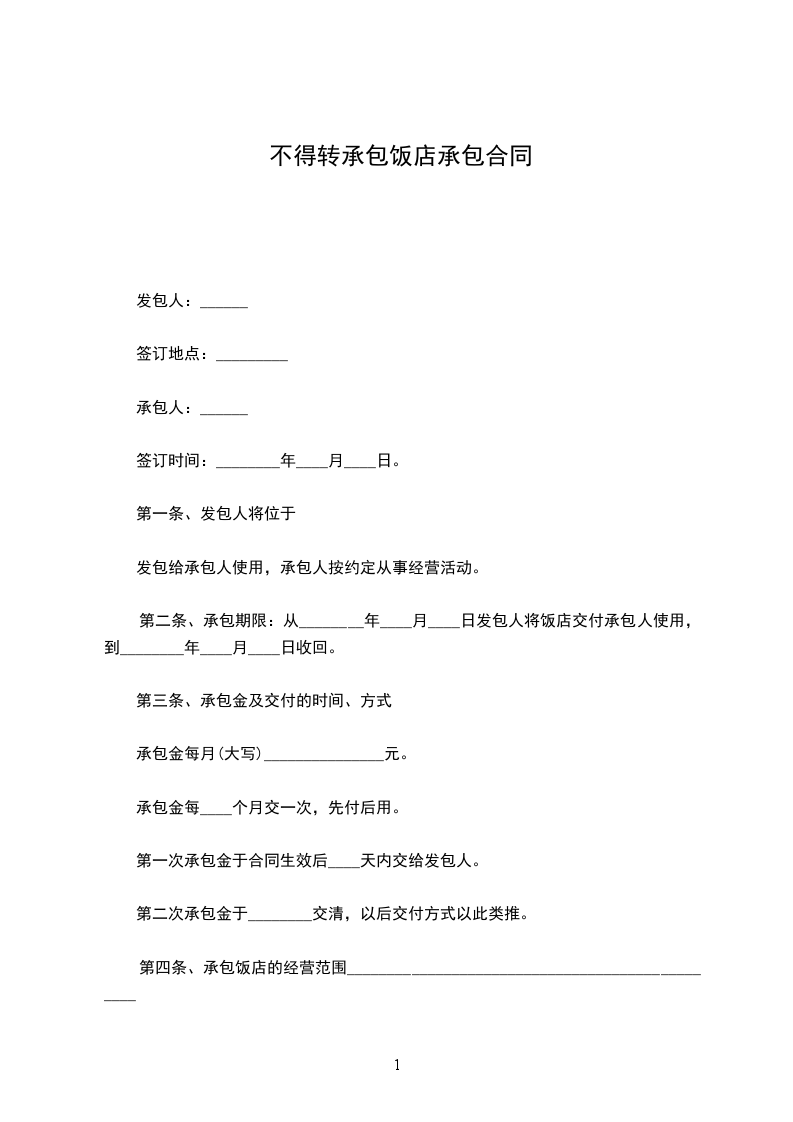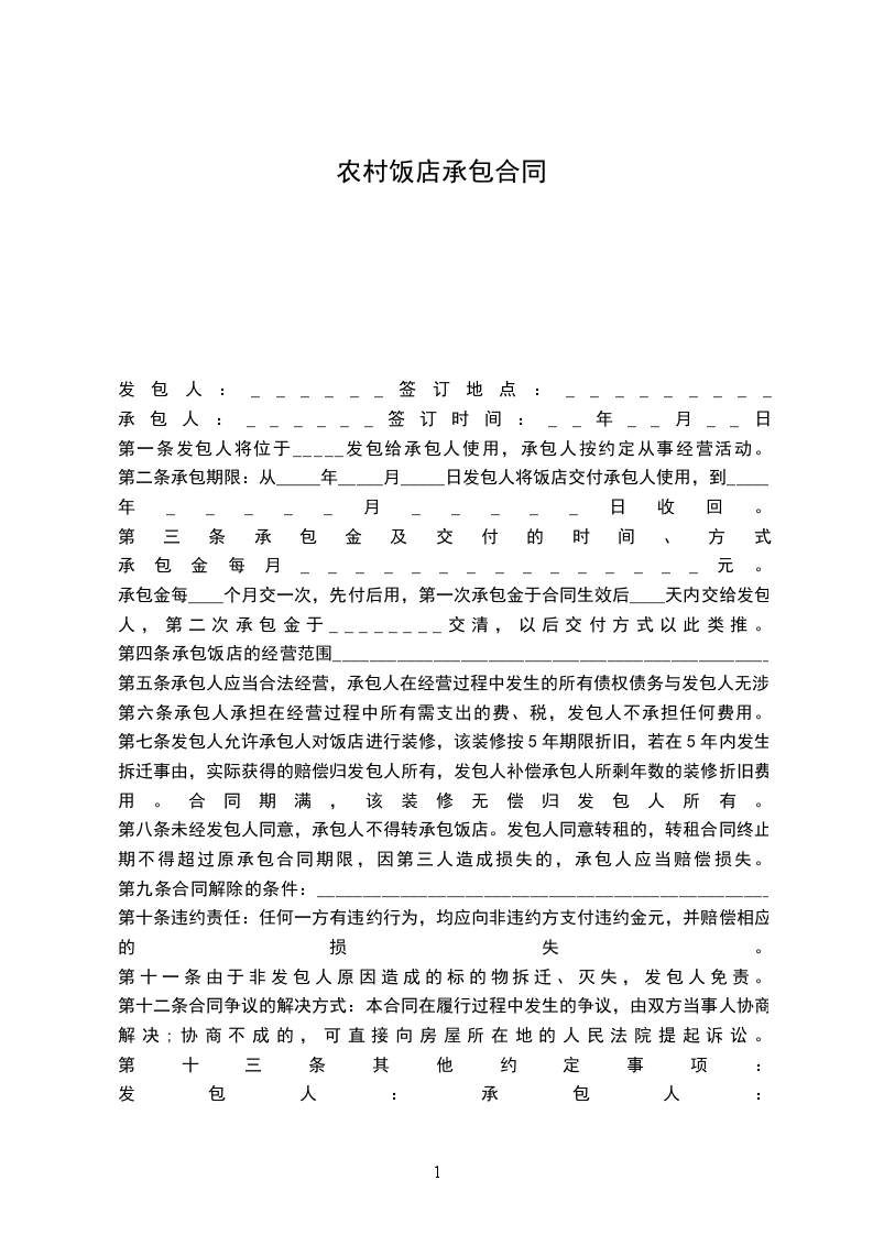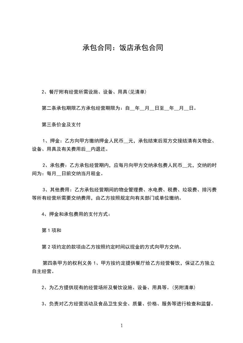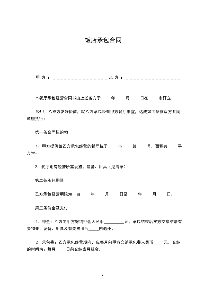 1、甲方提供给乙方承包经营的餐厅位于_____市_____路_____号,面积共_____平方米。
