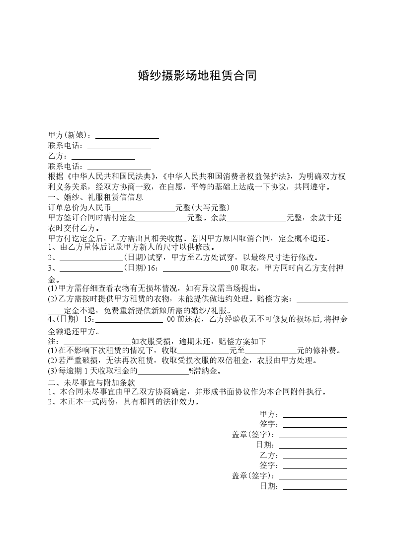 甲方(新娘):________________ 联系电话:________________ 乙方:________________ 联系电话:________________ 根据《中华人民共和国民法典》,《中华人民共和国消费者权益保护法》,为明确双方权利义务关系,经双方协商一致,在自愿,平等的基础上达成一下协议,共同遵守。 一、婚纱、礼服租赁信信息 订单总价为人民币________________元整(大写元整) 甲方签订合同时需付定金_____________元整。余款_______________元整,余款于还衣时交付乙方。 甲方付讫定金后,乙方需出具相关收据。若因甲方原因取消合同,定金概不退还。 1、由乙方量体后记录甲方新人的尺寸以供修改。 2、________________(日期)试穿,甲方至乙方处试穿,以最终尺寸进行修改。 3、________________(日期)16:_________________00取衣,甲方同时向乙方支付押金。 (1)甲方需仔细查看衣物有无损坏情况,如有异议需当场提出。 (2)乙方需按时提供甲方租赁的衣物,未能提供做违约处理。赔偿方案:_________________定金不退,免费重新提供新娘所需的婚纱/礼服。 4、(日期)15:_________________00前还衣,乙方经验收无不可修复的损坏后,将押金全额退还甲方。 注:_________________如衣服受损,逾期未还,赔偿方案如下 (1)在不影响下次租赁的情况下,收取_____________元至_____________元的修补费。 (2)若严重破损,无法再次租赁,收取受损衣服的双倍租金,衣服由甲方处理。 (3)每逾期1天收取租金的_____________%滞纳金。 二、未尽事宜与附加条款 1、本合同未尽事宜由甲乙双方协商确定,并形成书面协议作为本合同附件执行。 2、本正本一式两份,具有相同的法律效力。 甲方:________________ 签字:________________ 盖章(签字):_________________ 日期:_________________ 乙方:________________ 签字:________________ 盖章(签字):_________________ 日期:________________