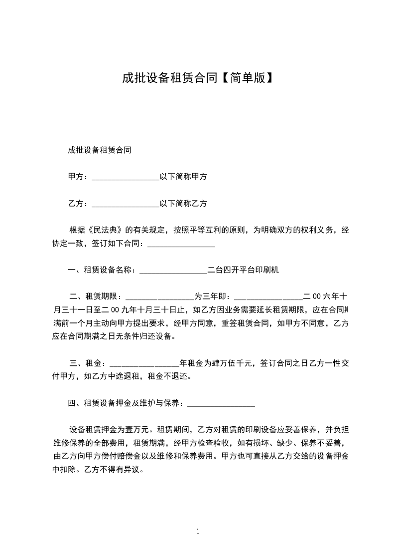 一、租赁设备名称:_________________二台四开平台印刷机