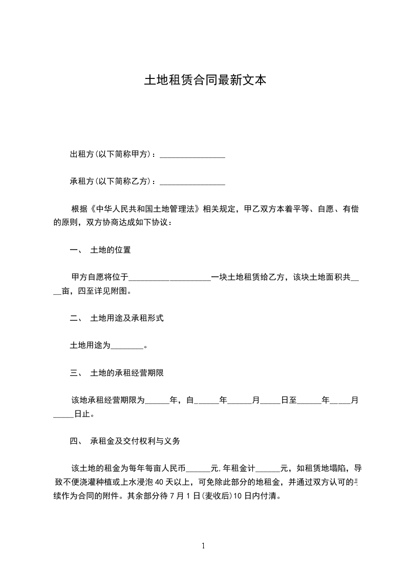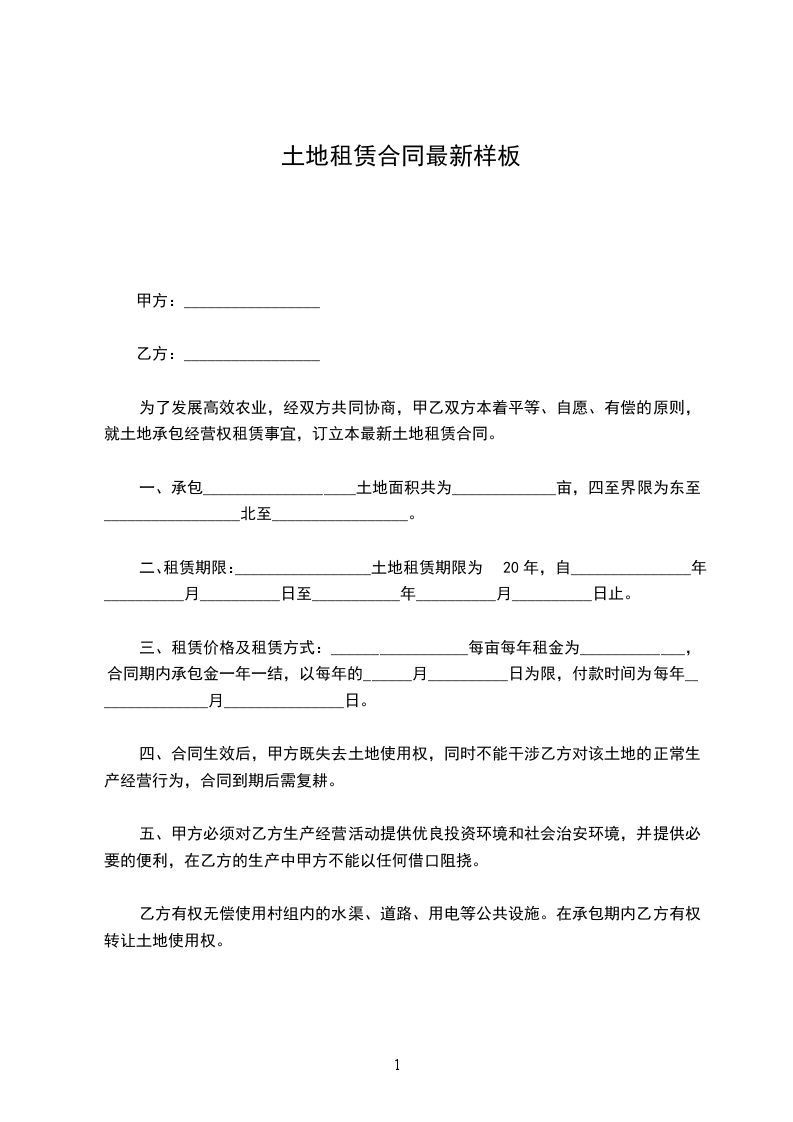 为了发展高效农业,经双方共同协商,甲乙双方本着平等、自愿、有偿的原则,就土地承包经营权租赁事宜,订立本最新土地租赁合同。