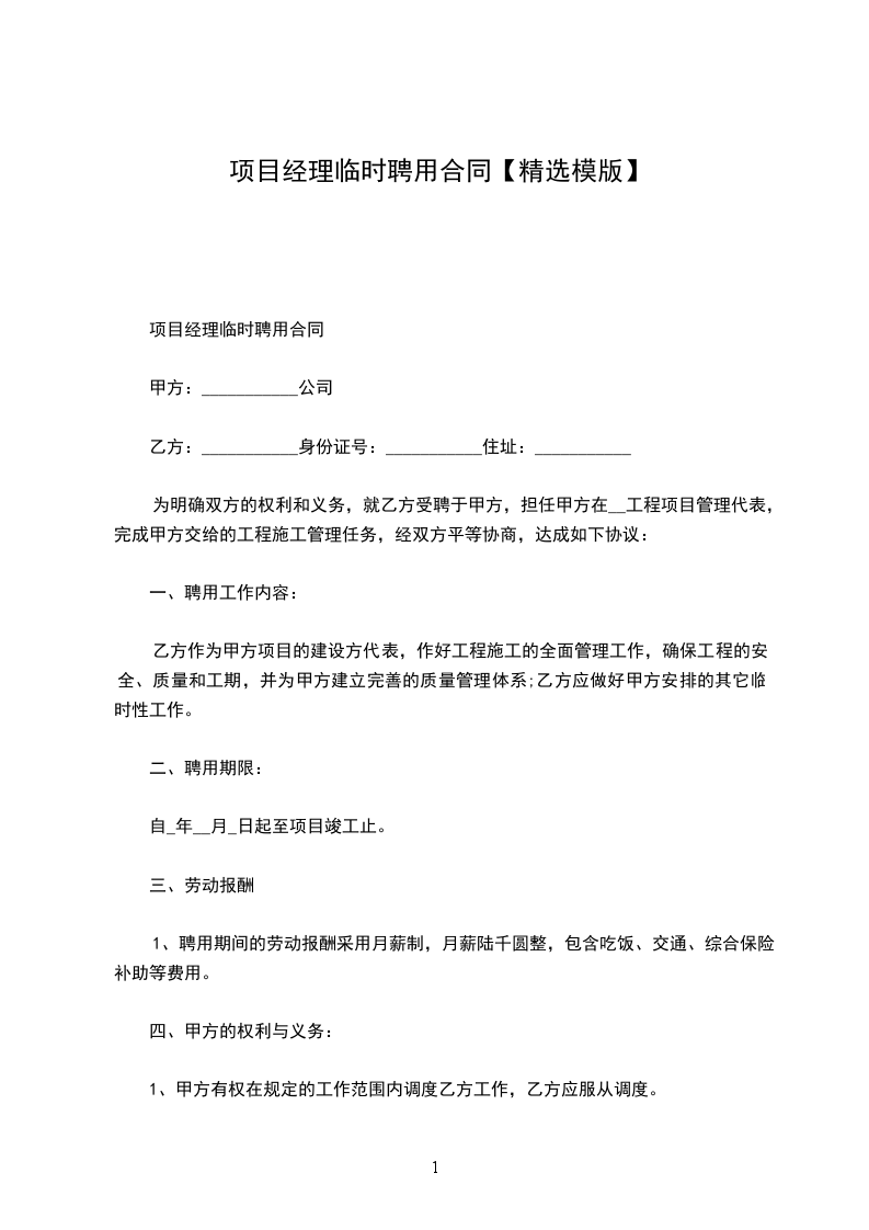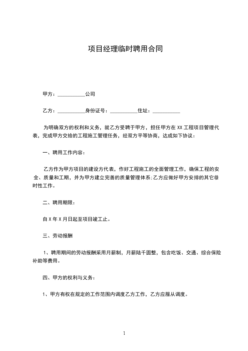 为明确双方的权利和义务,就乙方受聘于甲方,担任甲方在XX工程项目管理代表,完成甲方交给的工程施工管理任务,经双方平等协商,达成如下协议: