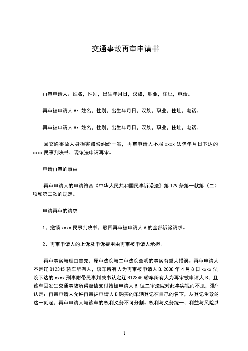 因交通事故人身损害赔偿纠纷一案,再审申请人不服xxxx法院_____年_____月_____日下达的xxxx民事判决书,现依法申请再审。
