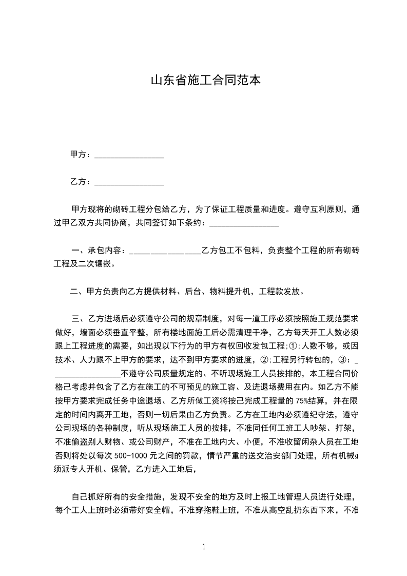 三、乙方进场后必须遵守公司的规章制度,对每一道工序必须按照施工规范要求做好,墙面必须垂直平整,所有楼地面施工后必需清理干净,乙方每天开工人数必须跟上工程进度的需要,如出现以下行为的甲方有权回收发包工程;①;人数不够,或因技术、人力跟不上甲方的要求,达不到甲方要求的进度,②;工程另行转包的,③:_________________不遵守公司质量规定的、不听现场施工人员按排的,本工程合同价格己考虑并包含了乙方在施工的不可预见的施工容、及进退场费用在内。如乙方不能按甲方要求完成任务中途退场、乙方所做工资将按己完成工程量的75%结算,并在限定的时间内离开工地,否则一切后果由乙方负责。乙方在工地内必须遵纪守法,遵守公司现场的各种制度,听从现场施工人员的按排,不准同任何工班工人吵架、打架,不准偷盗别人财物、或公司财产,不准在工地内大、小便,不准收留闲杂人员在工地,否则将处以每次500-1000元之间的罚款,情节严重的送交治安部门处理,所有机械必须派专人开机、保管,乙方进入工地后,