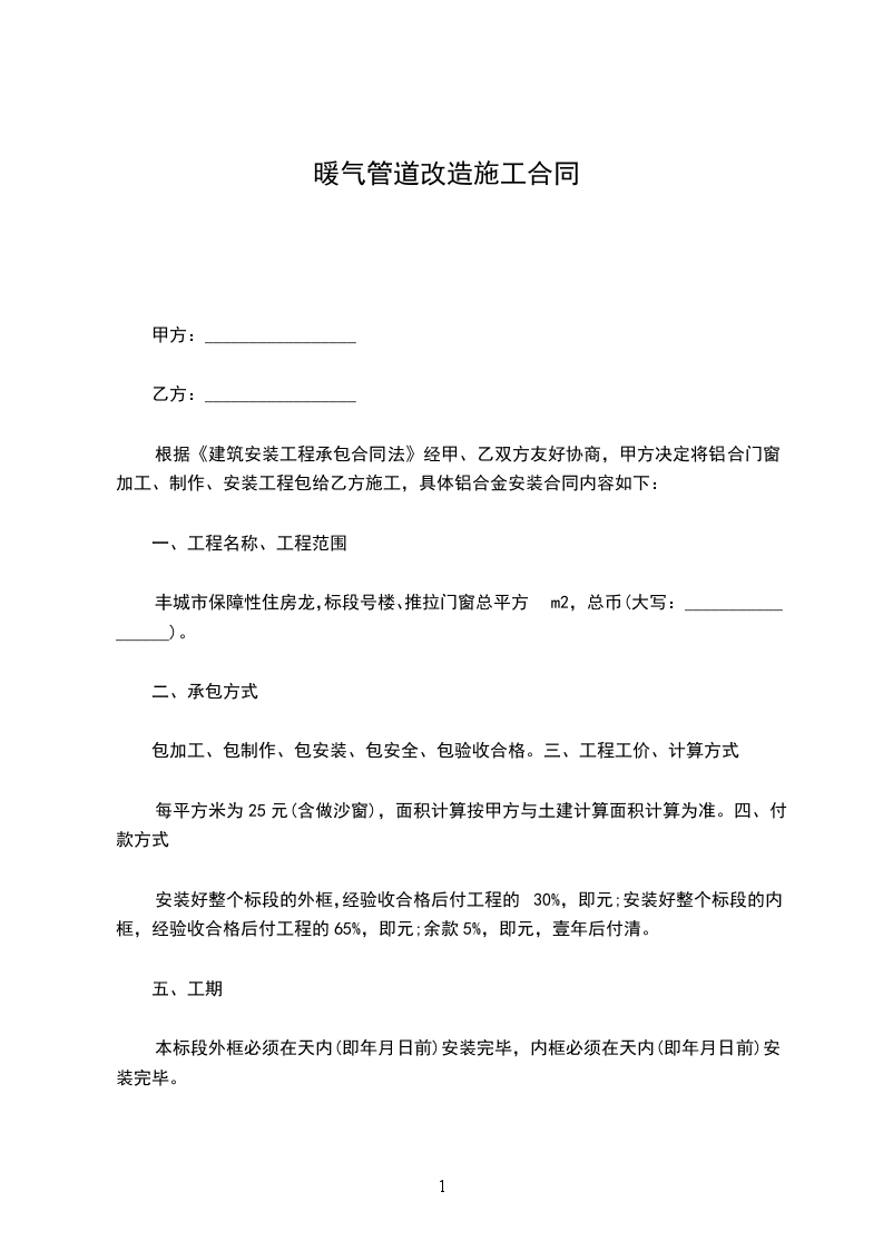 安装好整个标段的外框,经验收合格后付工程的30%,即元;安装好整个标段的内框,经验收合格后付工程的65%,即元;余款5%,即元,壹年后付清。