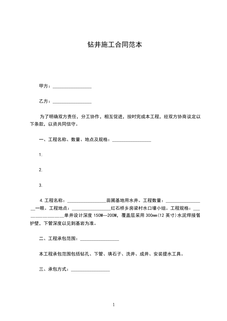 本工程承包范围包括钻孔、下管、填石子、洗井、成井、安装提水工具。