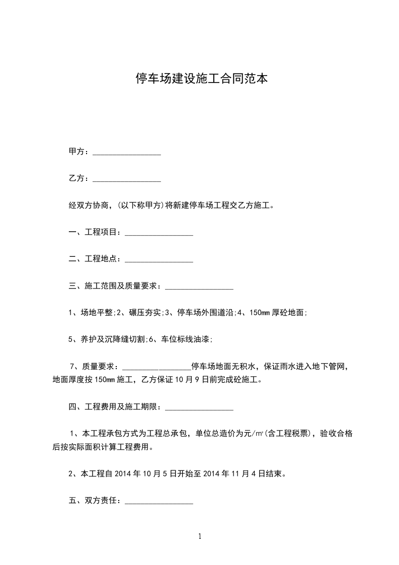 7、质量要求:_________________停车场地面无积水,保证雨水进入地下管网,地面厚度按150mm施工,乙方保证10月9日前完成砼施工。