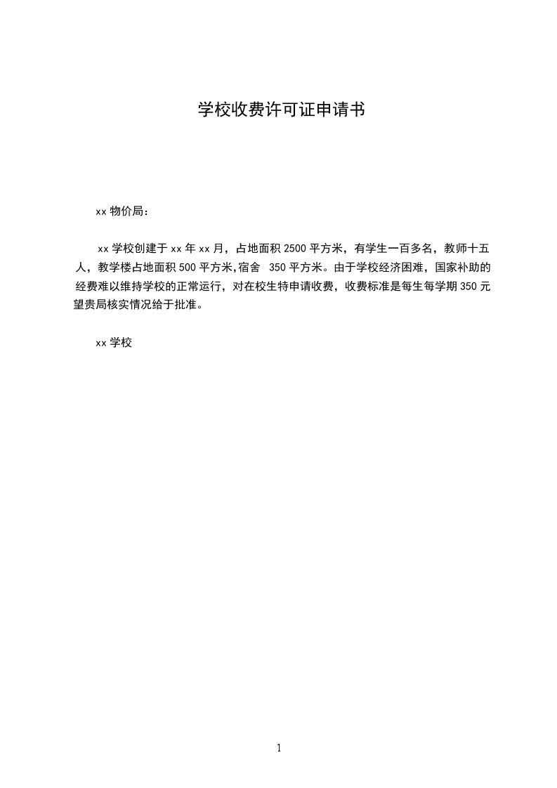 xx学校创建于xx年xx月,占地面积2500平方米,有学生一百多名,教师十五人,教学楼占地面积500平方米,宿舍350平方米。由于学校经济困难,国家补助的经费难以维持学校的正常运行,对在校生特申请收费,收费标准是每生每学期350元。望贵局核实情况给于批准。