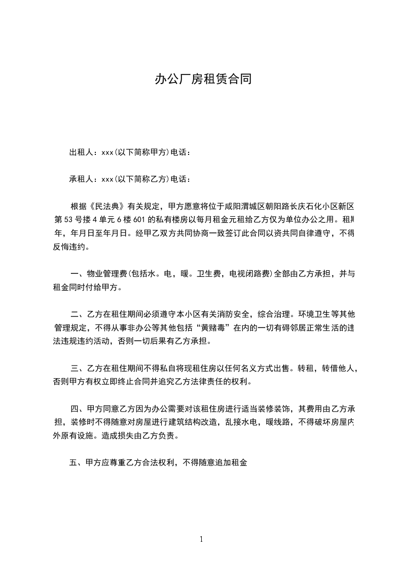 根据《民法典》有关规定,甲方愿意将位于咸阳渭城区朝阳路长庆石化小区新区第53号搂4单元6楼601的私有楼房以每月租金元租给乙方仅为单位办公之用。租期年,_____年_____月_____日至_____年_____月_____日。经甲乙双方共同协商一致签订此合同以资共同自律遵守,不得反悔违约。