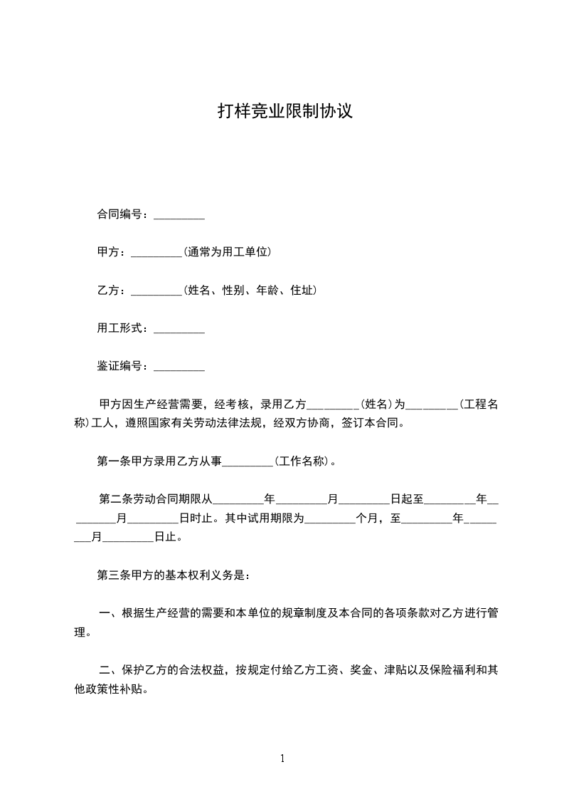 1、乙方承诺,未经甲方同意,在职期间不得自己经营或者为他人经营与甲方同类企业;