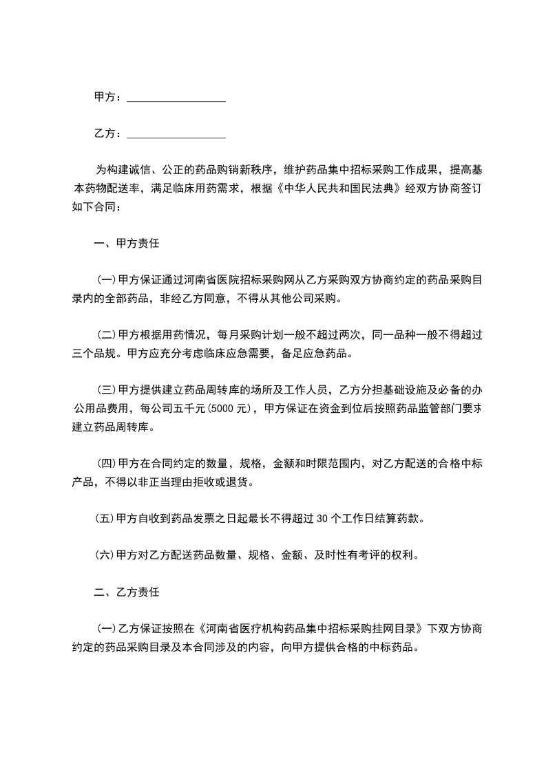 (一)乙方保证按照在《河南省医疗机构药品集中招标采购挂网目录》下双方协商约定的药品采购目录及本合同涉及的内容,向甲方提供合格的中标药品。
