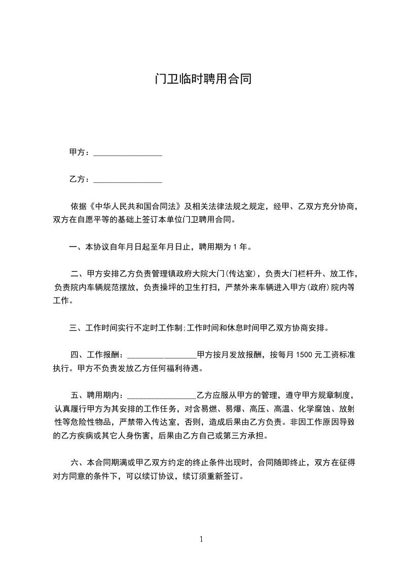 依据《中华人民共和国民法典》及相关法律法规之规定,经甲、乙双方充分协商,双方在自愿平等的基础上签订本单位门卫聘用合同。