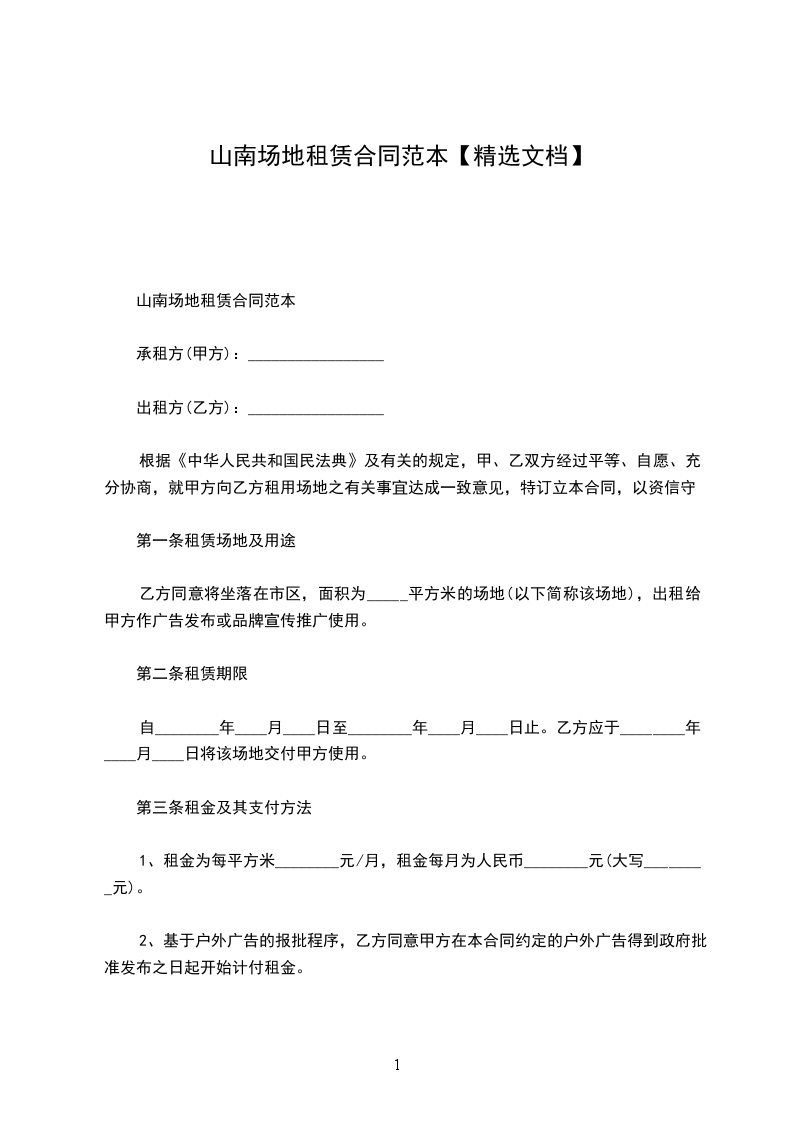 乙方同意将坐落在市区,面积为_____平方米的场地(以下简称该场地),出租给甲方作广告发布或品牌宣传推广使用。