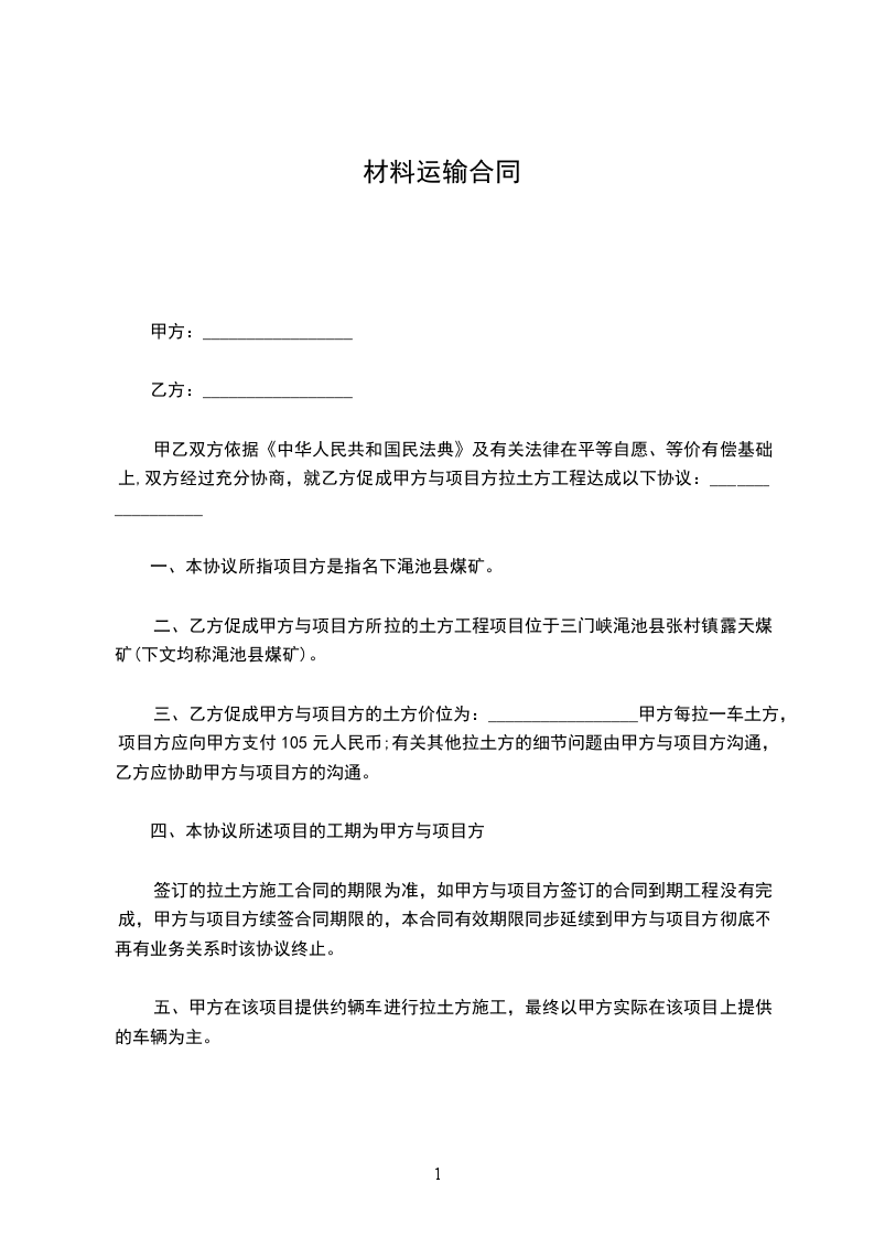 甲乙双方依据《中华人民共和国民法典》及有关法律在平等自愿、等价有偿基础上,双方经过充分协商,就乙方促成甲方与项目方拉土方工程达成以下协议:_________________