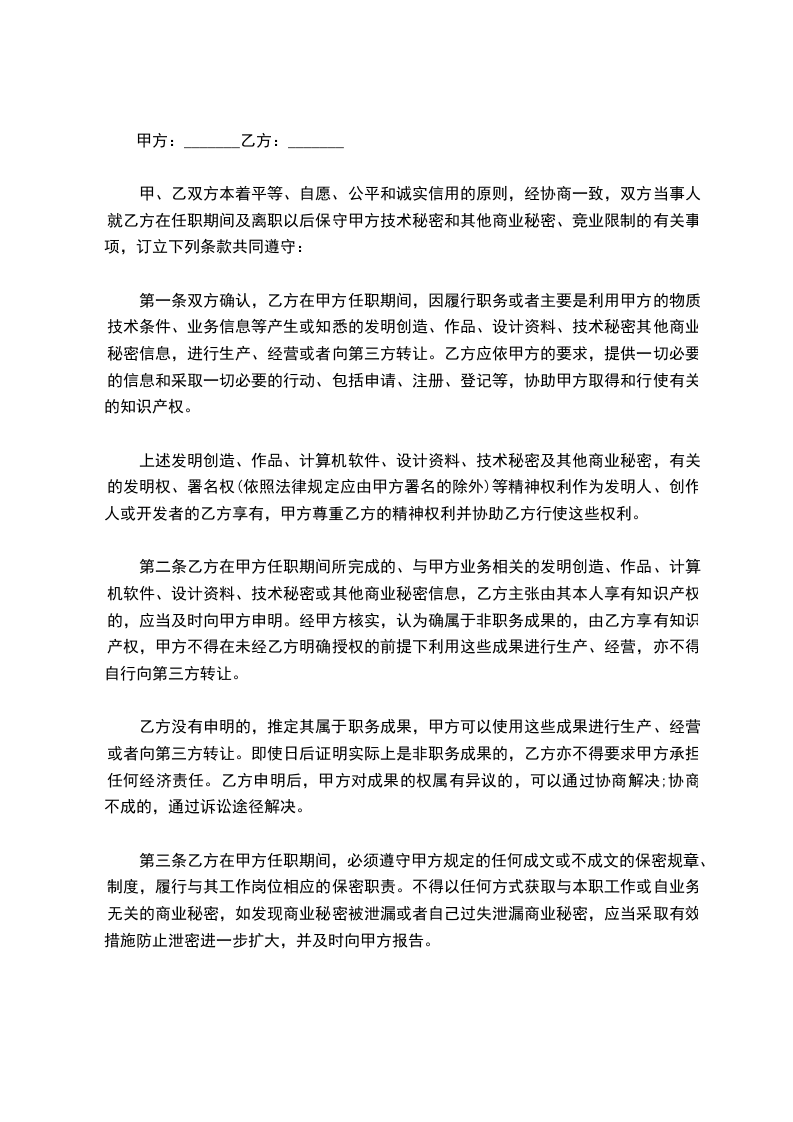 甲、乙双方本着平等、自愿、公平和诚实信用的原则,经协商一致,双方当事人就乙方在任职期间及离职以后保守甲方技术秘密和其他商业秘密、竞业限制的有关事项,订立下列条款共同遵守: