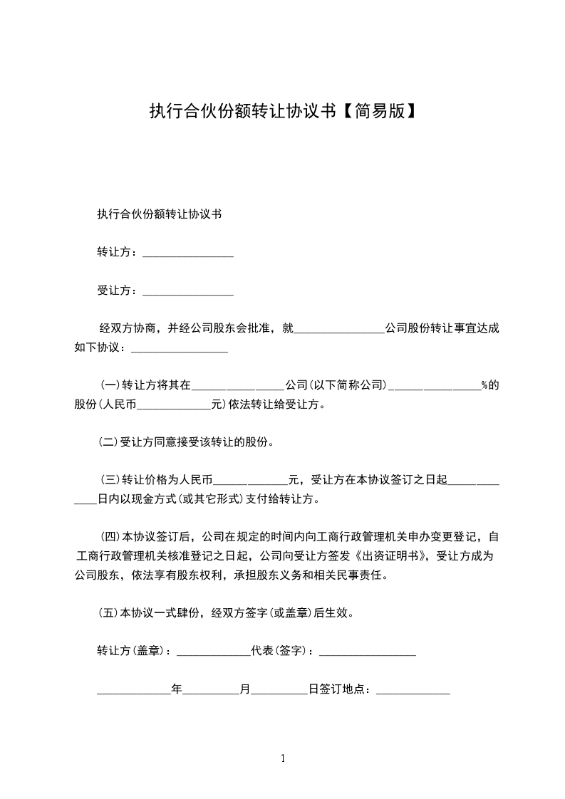 (一)转让方将其在________________公司(以下简称公司)________________%的股份(人民币_____________元)依法转让给受让方。
