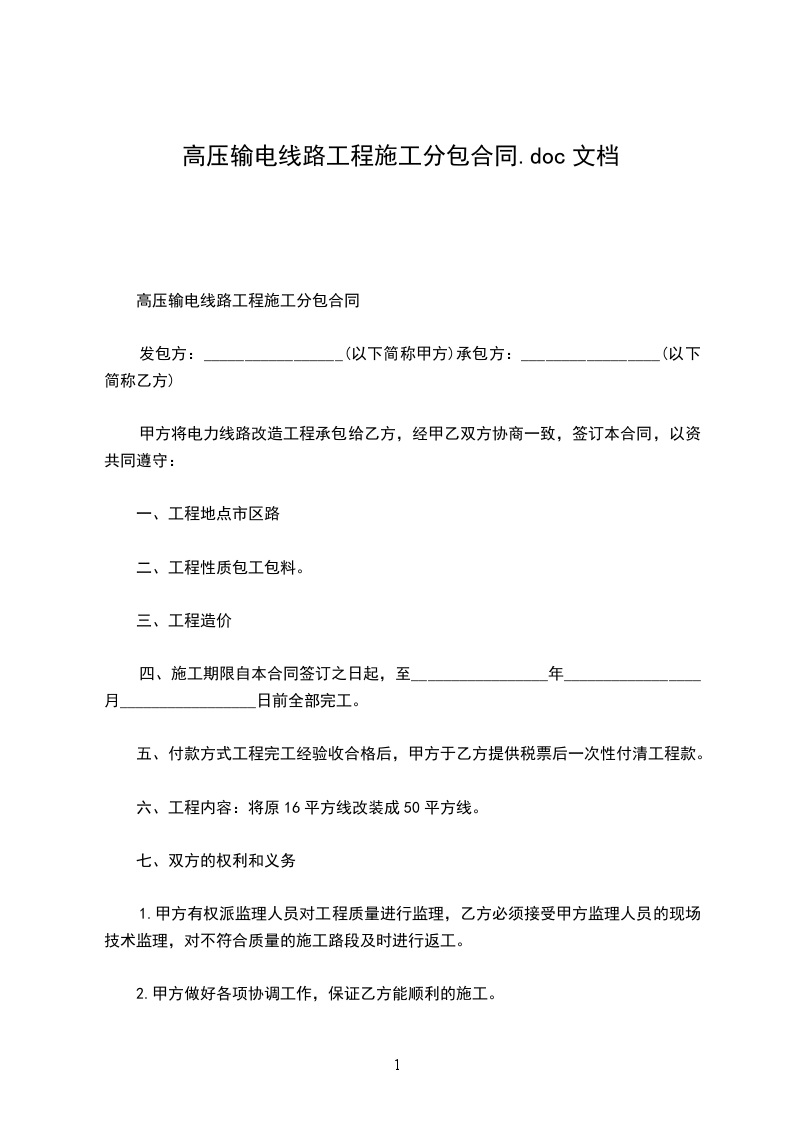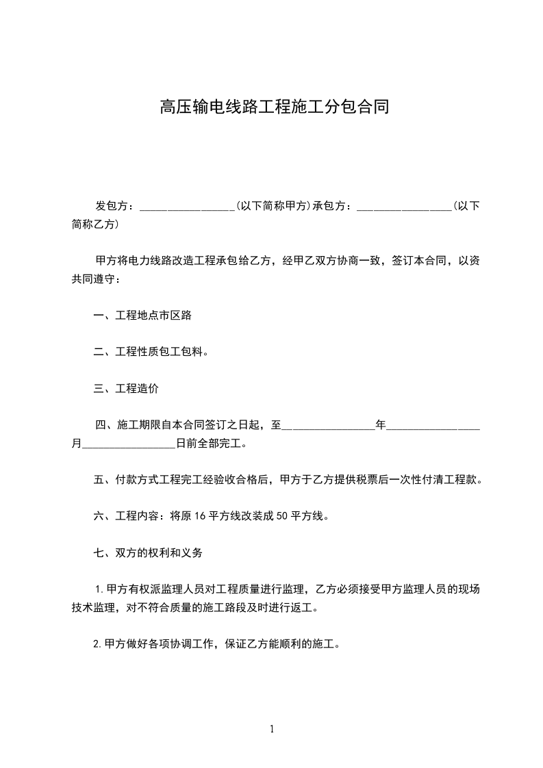 甲方将电力线路改造工程承包给乙方,经甲乙双方协商一致,签订本合同,以资共同遵守: