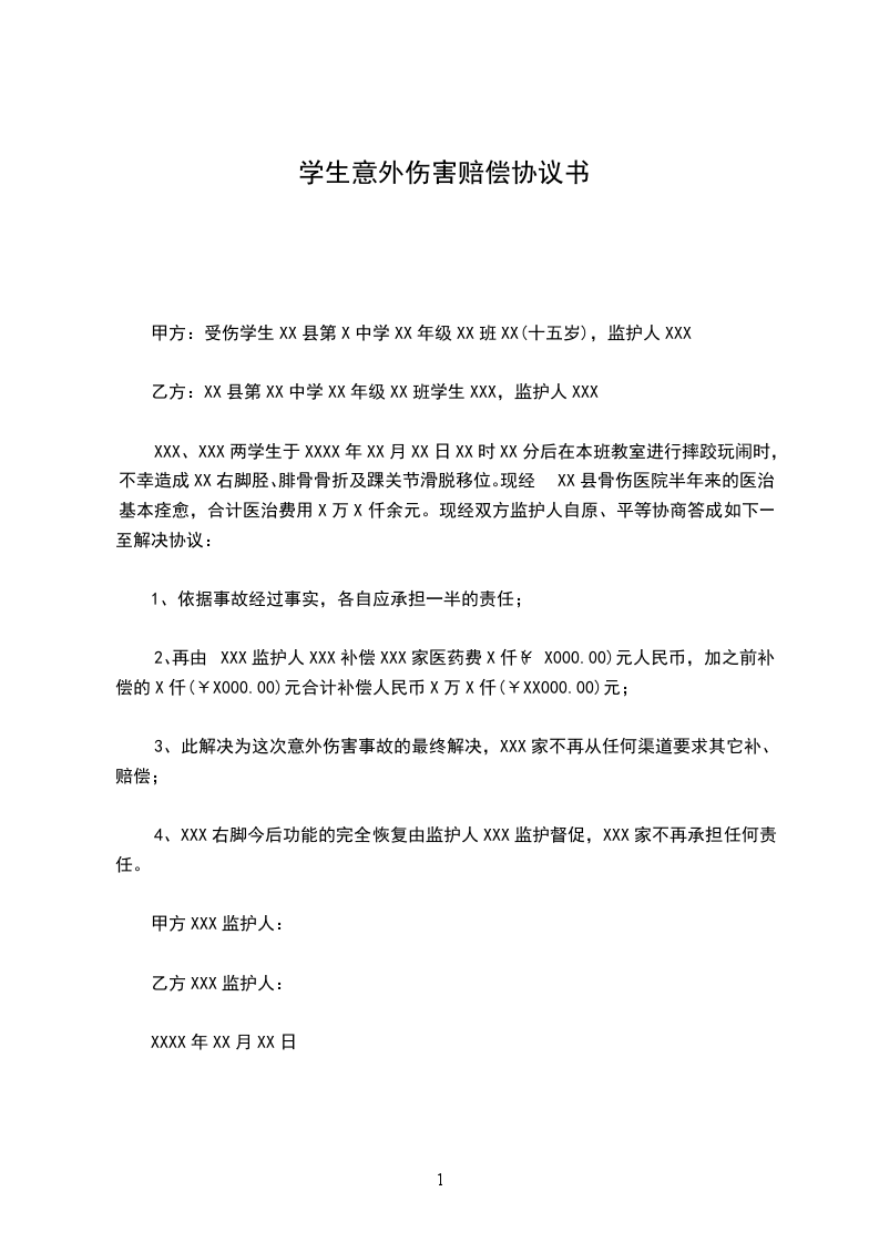 XXX、XXX两学生于XXXX年XX月XX日XX时XX分后在本班教室进行摔跤玩闹时,不幸造成XX右脚胫、腓骨骨折及踝关节滑脱移位。现经XX县骨伤医院半年来的医治基本痊愈,合计医治费用X万X仟余元。现经双方监护人自原、平等协商答成如下一至解决协议: