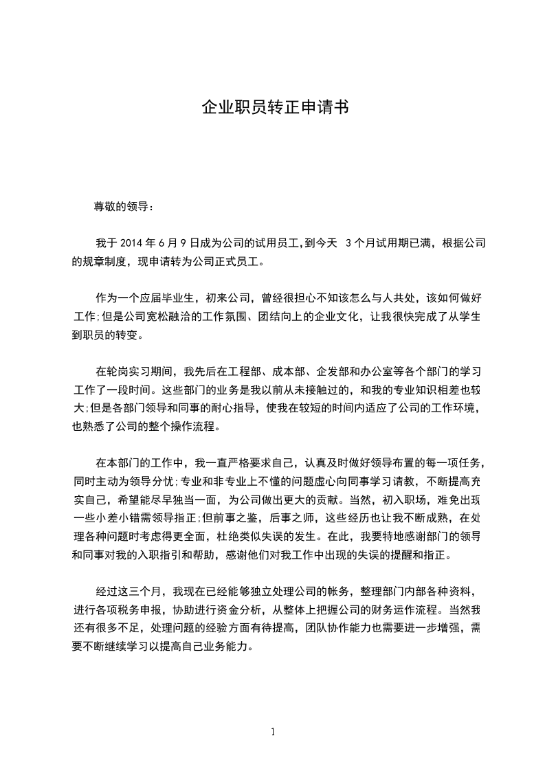 我于2024年6月9日成为公司的试用员工,到今天3个月试用期已满,根据公司的规章制度,现申请转为公司正式员工。