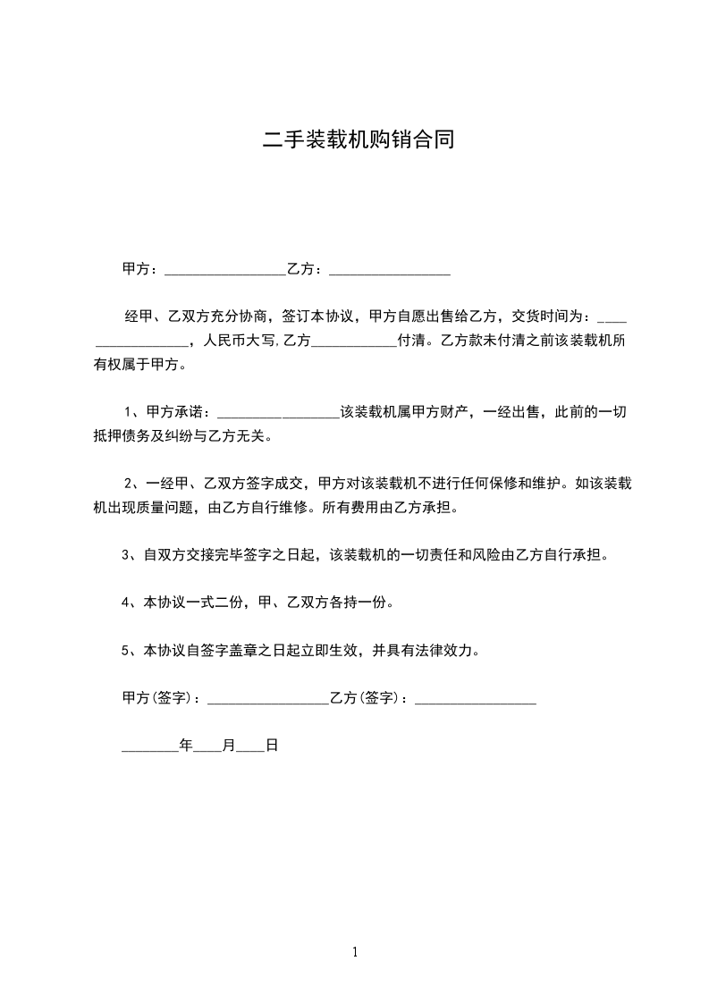 1、甲方承诺:_________________该装载机属甲方财产,一经出售,此前的一切抵押债务及纠纷与乙方无关。