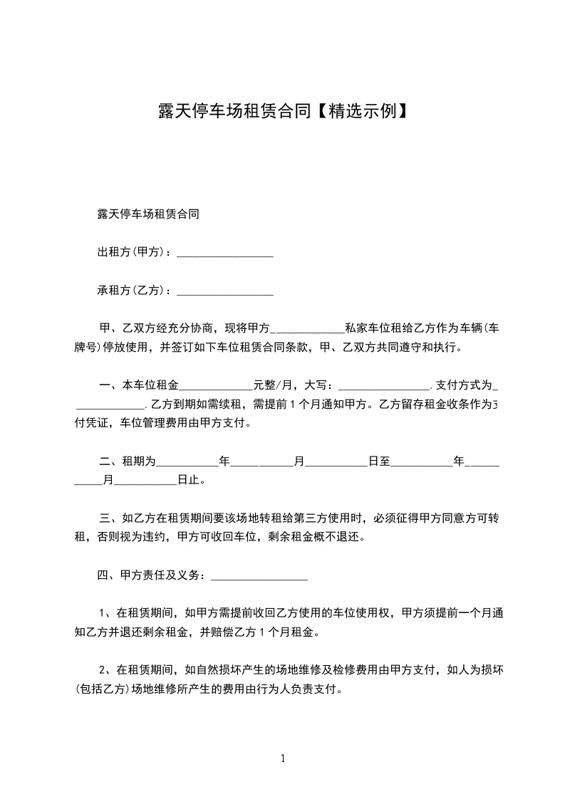 一、本车位租金_____________元整/月,大写:________________.支付方式为_____________.乙方到期如需续租,需提前1个月通知甲方。乙方留存租金收条作为支付凭证,车位管理费用由甲方支付。