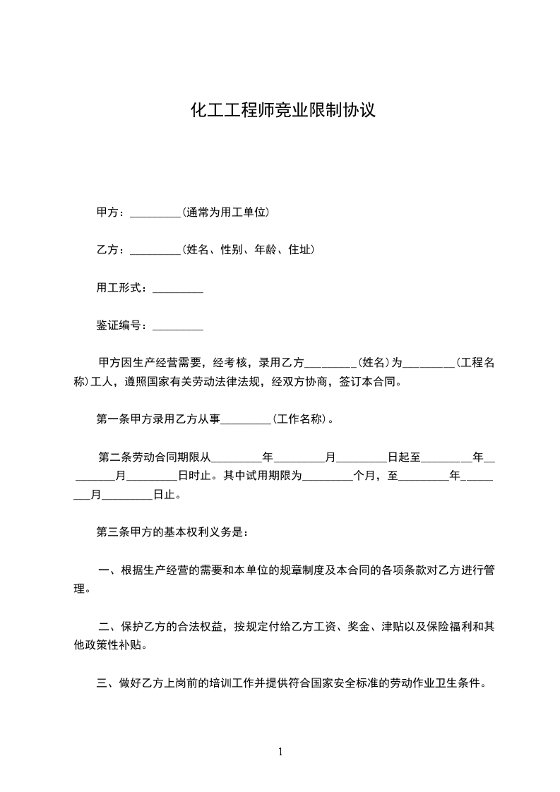 化工工程师竞业限制协议