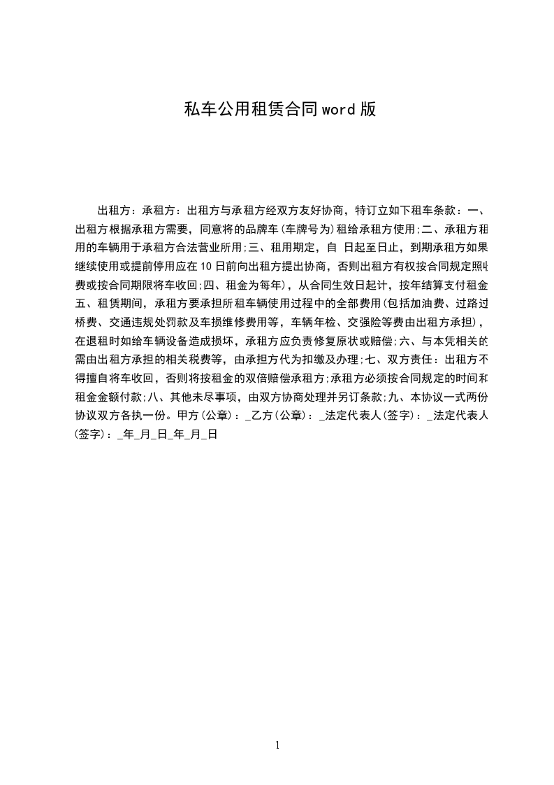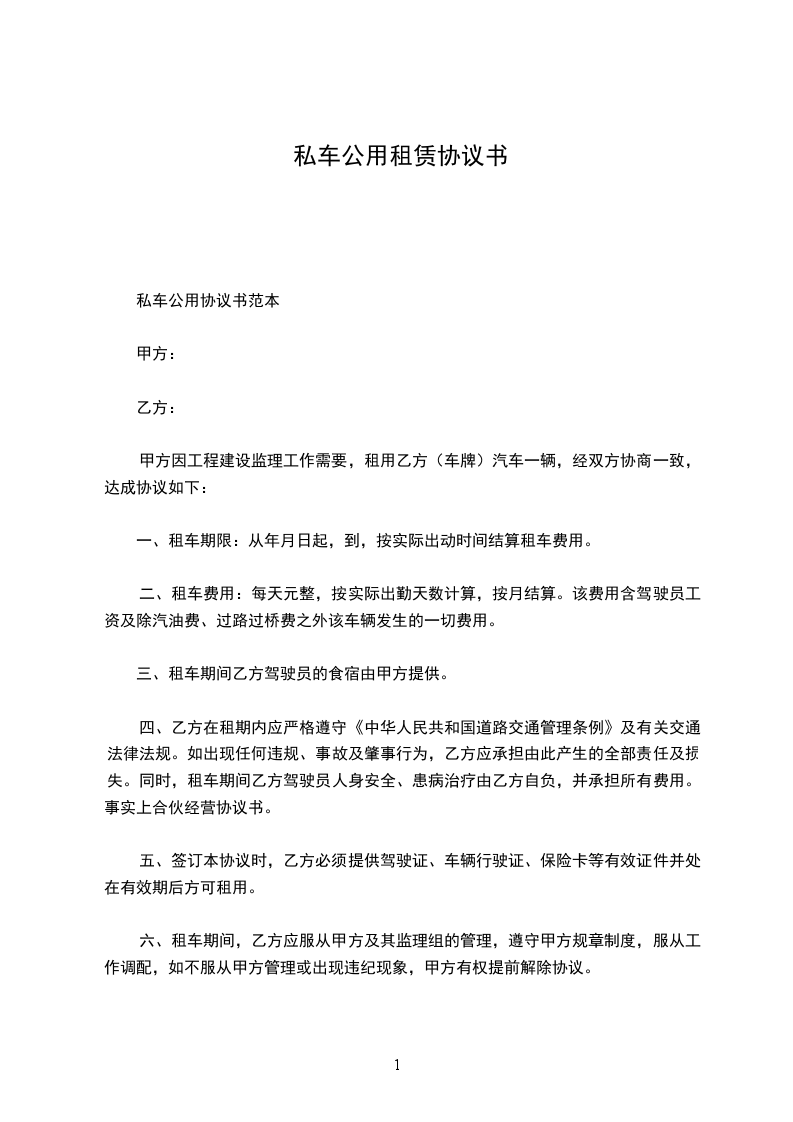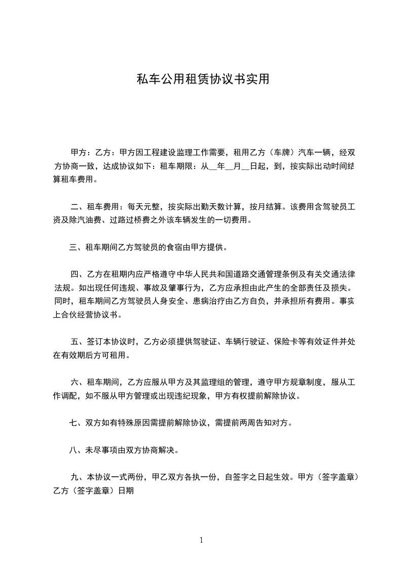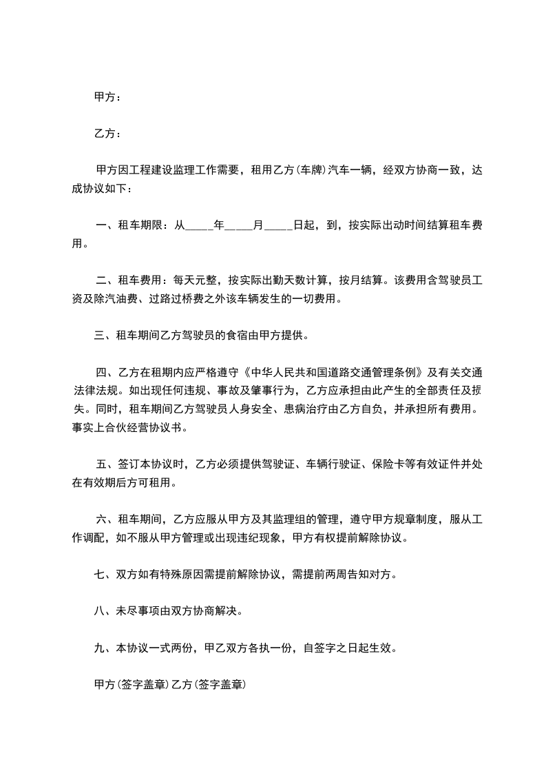 甲方因工程建设监理工作需要,租用乙方(车牌)汽车一辆,经双方协商一致,达成协议如下: