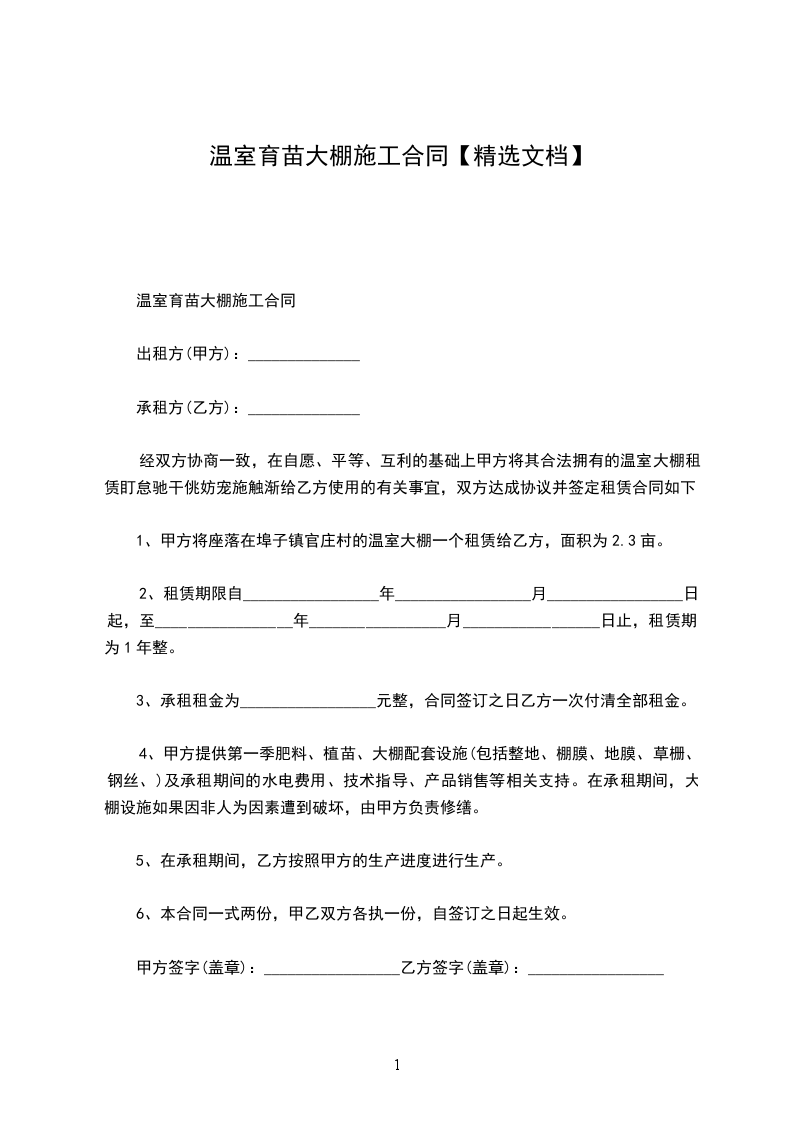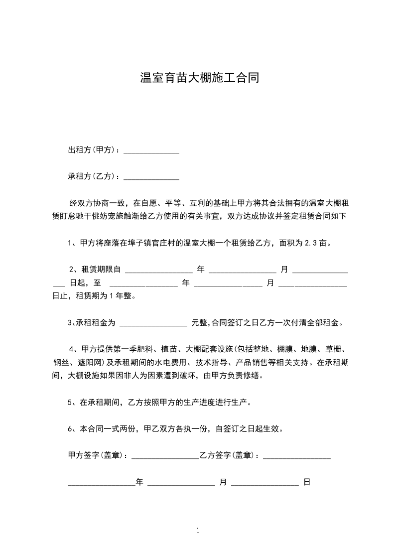 1、甲方将座落在埠子镇官庄村的温室大棚一个租赁给乙方,面积为2.3亩。