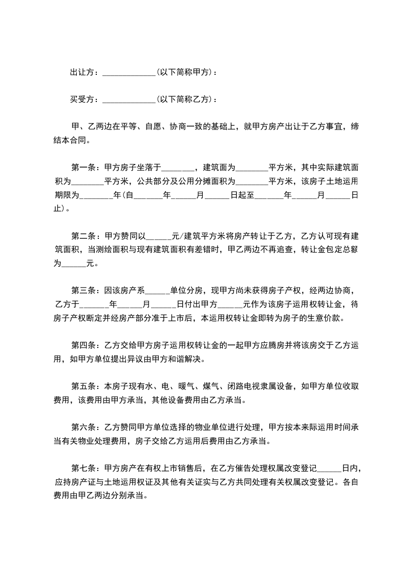 4、由于本房产系公司职工集中管理的房产,甲方承诺在乙方使用该房产时,公司规定的允许甲方享有的关于该房产的一切福利转由乙方享有,甲方不向乙方以任何理由要求支付。公司和相关其他部门要求甲方支付的各项费用(各项费用包括:水、电、煤气、天然气、有线电视、电话、宽带以及物业管理等费用),转由乙方支付,甲乙双方均不得以此为由提出变更和解除合同;