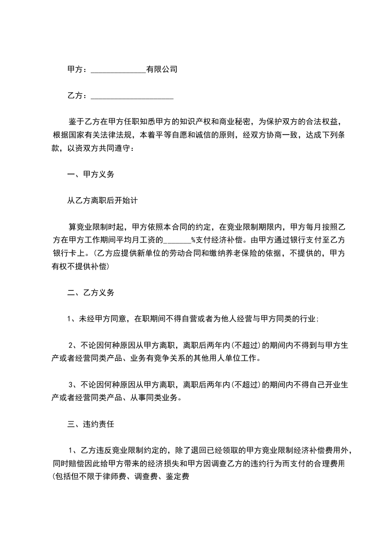 2、甲方不履行义务,无故拒绝支付乙方的竞业限制补偿费的,甲方应当一次性支付乙方违约金人民币______________元,本合同终止。