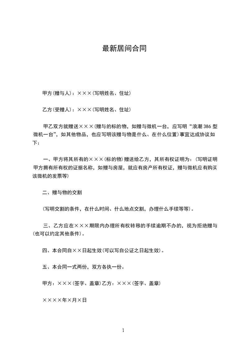 一、甲方将其所有的×××(标的物)赠送给乙方,其所有权证明为:(写明证明甲方拥有所有权的证据名称,如赠与房屋,就应有房产所有权证,赠与微机应有购买该微机的发票等)