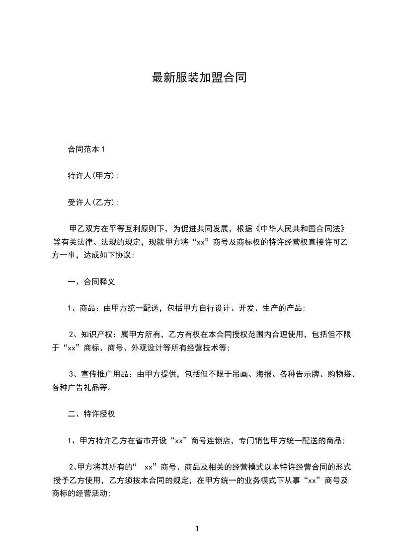 为提升品牌的信誉和消费者的合法权益。本着双方互利互惠、共同协作的原则,遵循我国《民法典》商标专利等有关法律、法规及_____市_____服装公司经营管理模式,现就授权委托“_____”服装代理事宜,依法订立本服装加盟代理合同。