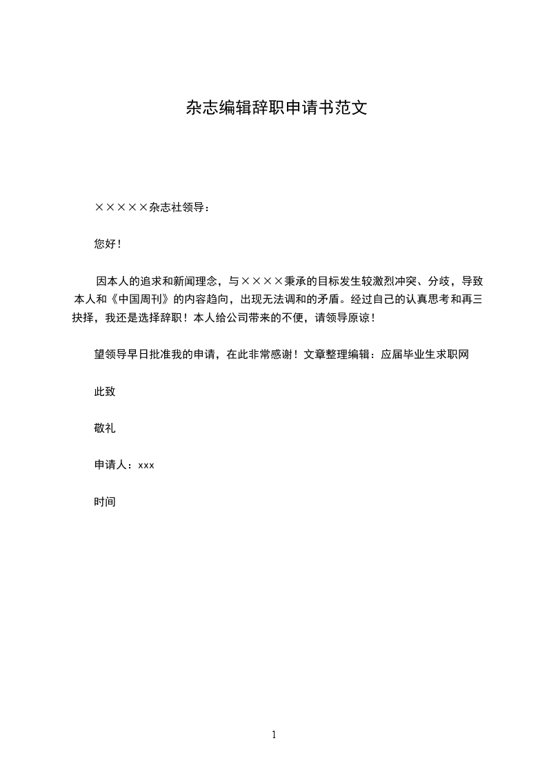 因本人的追求和新闻理念,与××××秉承的目标发生较激烈冲突、分歧,导致本人和《中国周刊》的内容趋向,出现无法调和的矛盾。经过自己的认真思考和再三抉择,我还是选择辞职!本人给公司带来的不便,请领导原谅!