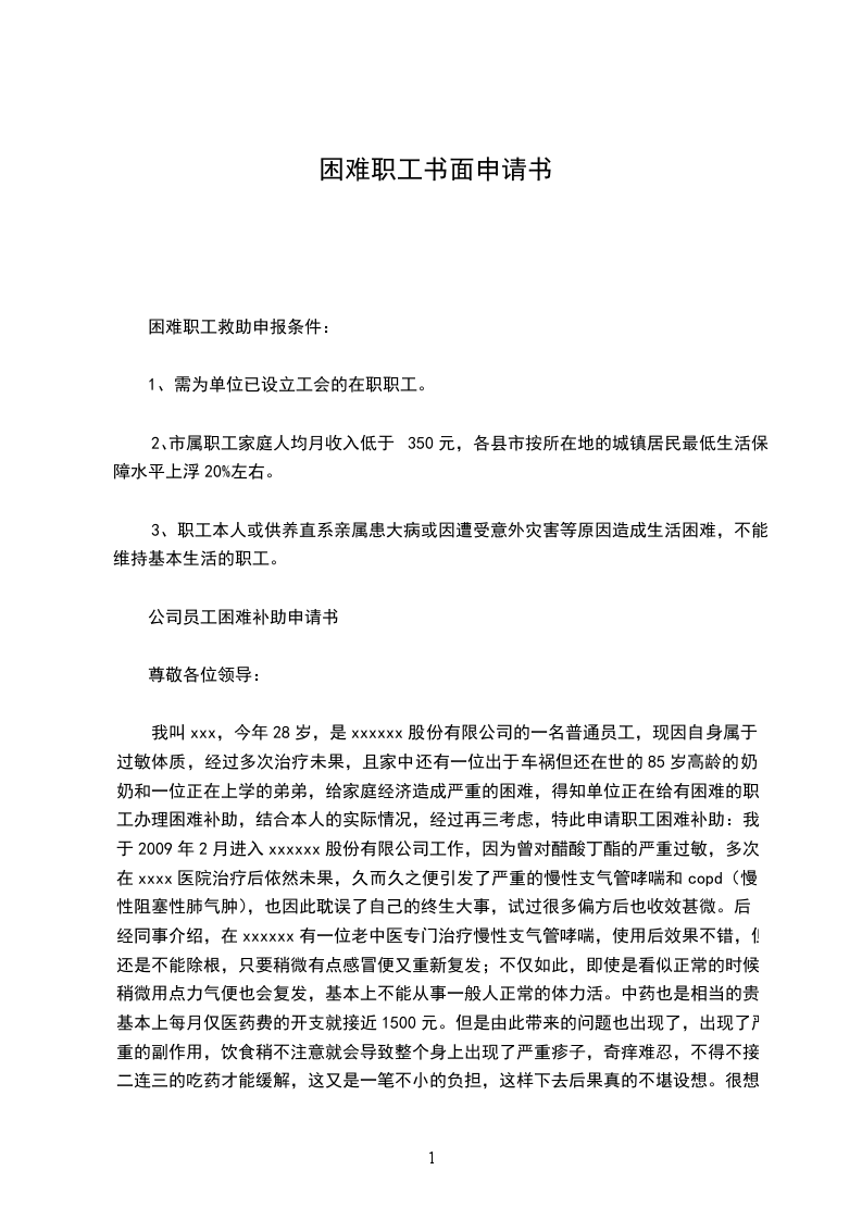 我叫xxx,今年28岁,是xxxxxx股份有限公司的一名普通员工,现因自身属于过敏体质,经过多次治疗未果,且家中还有一位出于车祸但还在世的85岁高龄的奶奶和一位正在上学的弟弟,给家庭经济造成严重的困难,得知单位正在给有困难的职工办理困难补助,结合本人的实际情况,经过再三考虑,特此申请职工困难补助:我于2009年2月进入xxxxxx股份有限公司工作,因为曾对醋酸丁酯的严重过敏,多次在xxxx医院治疗后依然未果,久而久之便引发了严重的慢性支气管哮喘和copd(慢性阻塞性肺气肿),也因此耽误了自己的终生大事,试过很多偏方后也收效甚微。后经同事介绍,在xxxxxx有一位老中医专门治疗慢性支气管哮喘,使用后效果不错,但还是不能除根,只要稍微有点感冒便又重新复发;不仅如此,即使是看似正常的时候稍微用点力气便也会复发,基本上不能从事一般人正常的体力活。中药也是相当的贵,基本上每月仅医药费的开支就接近1500元。但是由此带来的问题也出现了,出现了严重的副作用,饮食稍不注意就会导致整个身上出现了严重疹子,奇痒难忍,不得不接二连三的吃药才能缓解,这又是一笔不小的负担,这样下去后果真的不堪设想。很想一次性治好,哪怕是花再多的钱,但就是找不到能彻底治愈的医院。附院每次开的药物只是治标不治本,而且药费贵的吓人,根本不是我现在能承受的了得,心理上也担负了很大的压力。家中现在还有一位85岁高龄的奶奶,2006年4月因一次交通事故伤了脑部神经,肇事人虽然赔付了医疗费用,但出院后因留下后遗症导致生活不能自理,现在依然在世,不仅生活上需要人照顾,而且也需要药物来维持,也因此借了不少钱。弟弟现在还在上学,每年的学费也是一笔不小的开支。因父母都是农民,整个家庭的收入就只剩下我的工资和父母不到2亩地的收入。考虑到家里实在困难,特此向有关部门提出申请困难职工补助,希望予以审核批准!此致敬礼!