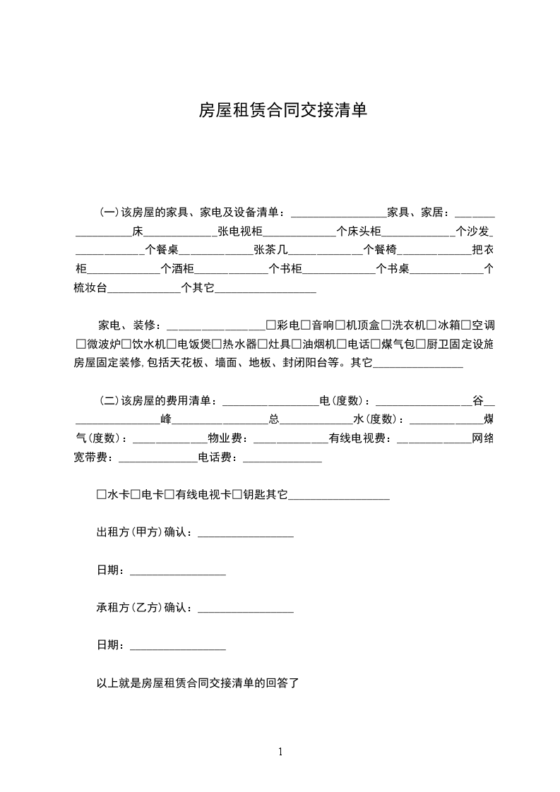 (一)该房屋的家具、家电及设备清单:_________________家具、家居:_________________床_____________张电视柜_____________个床头柜_____________个沙发_____________个餐桌_____________张茶几_____________个餐椅_____________把衣柜_____________个酒柜_____________个书柜_____________个书桌_____________个梳妆台_____________个其它__________________