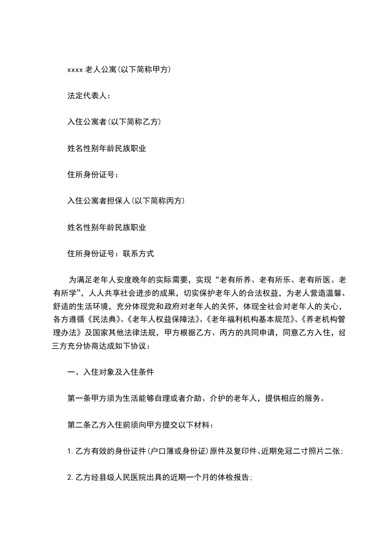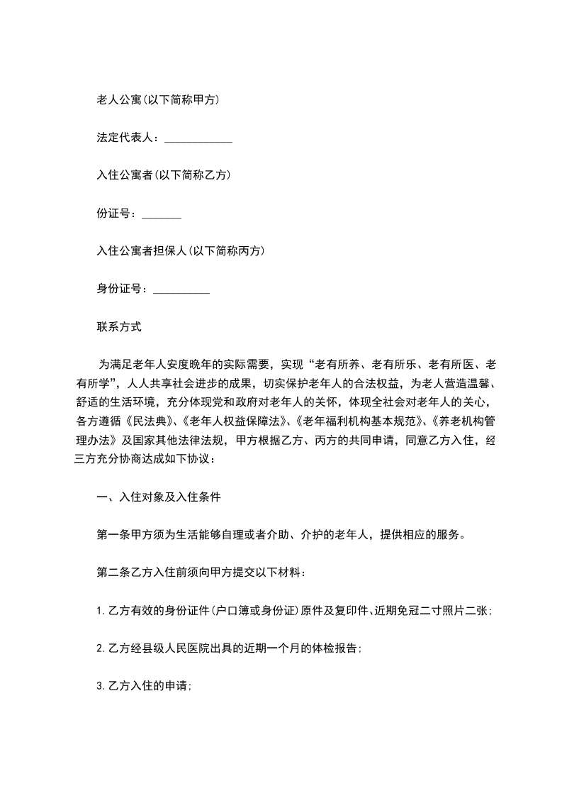 为满足老年人安度晚年的实际需要,实现“老有所养、老有所乐、老有所医、老有所学”,人人共享社会进步的成果,切实保护老年人的合法权益,为老人营造温馨、舒适的生活环境,充分体现党和政府对老年人的关怀,体现全社会对老年人的关心,各方遵循《民法典》、《老年人权益保障法》、《老年福利机构基本规范》、《养老机构管理办法》及国家其他法律法规,甲方根据乙方、丙方的共同申请,同意乙方入住,经三方充分协商达成如下协议: