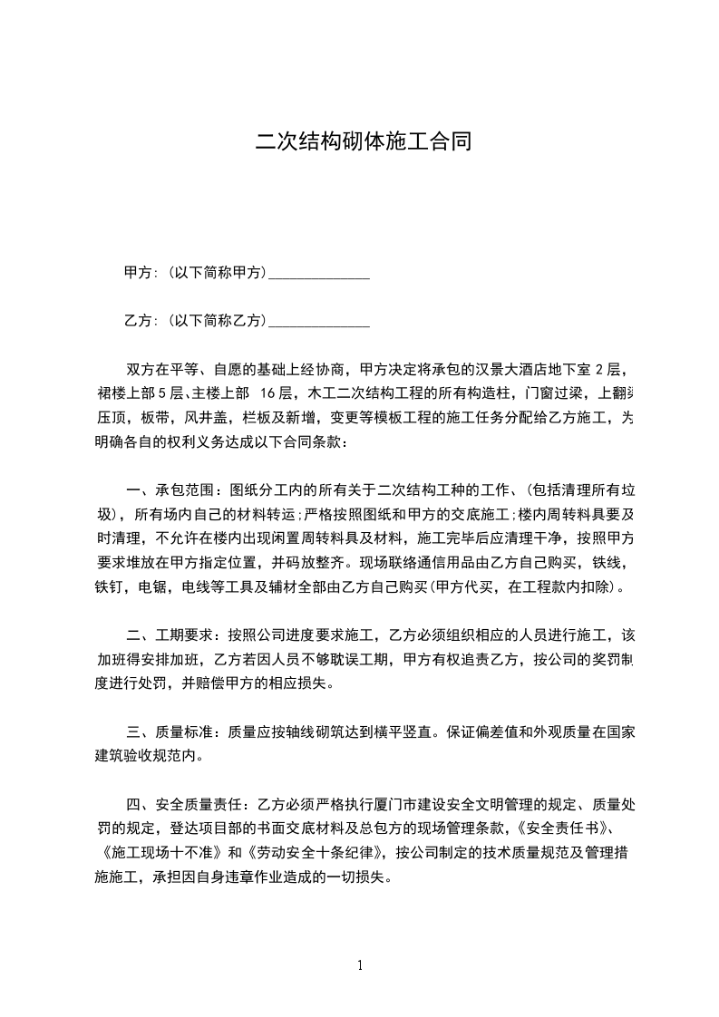 一、承包范围:图纸分工内的所有关于二次结构工种的工作、(包括清理所有垃圾),所有场内自己的材料转运;严格按照图纸和甲方的交底施工;楼内周转料具要及时清理,不允许在楼内出现闲置周转料具及材料,施工完毕后应清理干净,按照甲方要求堆放在甲方指定位置,并码放整齐。现场联络通信用品由乙方自己购买,铁线,铁钉,电锯,电线等工具及辅材全部由乙方自己购买(甲方代买,在工程款内扣除)。